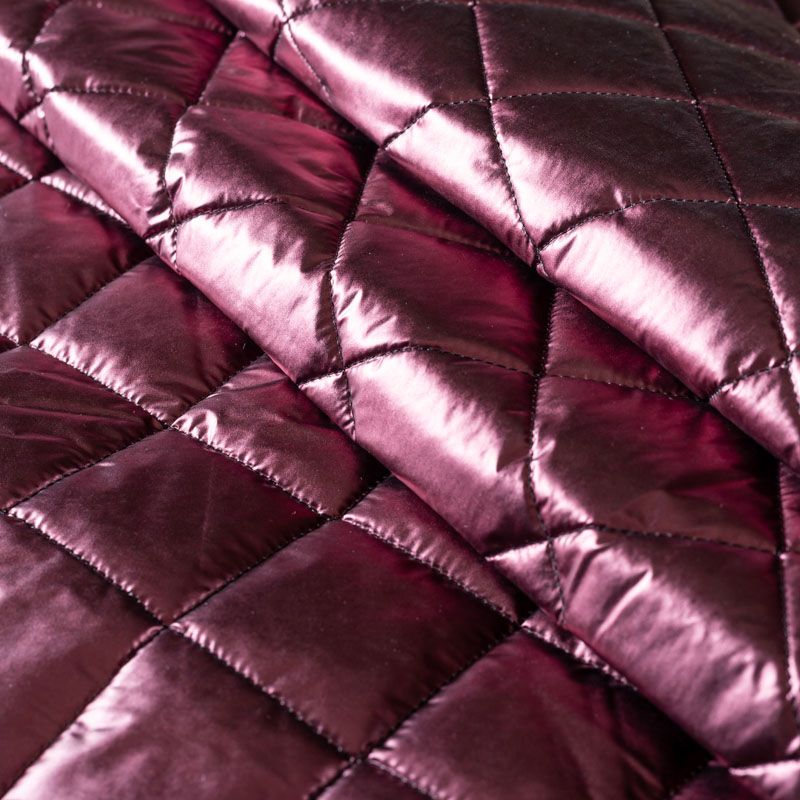 Трехслойная итальянская курточная ткань красивого сливового оттенка с легким эффектом металлик, простеганная не крупными ромбами размером 3х3 см. Нижний, черного цвета, заменяет подклад и верхний слой - полиэстер, по качеству напоминает болонь, между ними синтепон. Ткань легкая, пластичная, хорошо драпируется. Прекрасно подойдет для  пошива легких пальто, курток, бомберов, жилетов, накидок-кейпов, объемных сумок, одежды для домашних питомцев, туристического снаряжения.