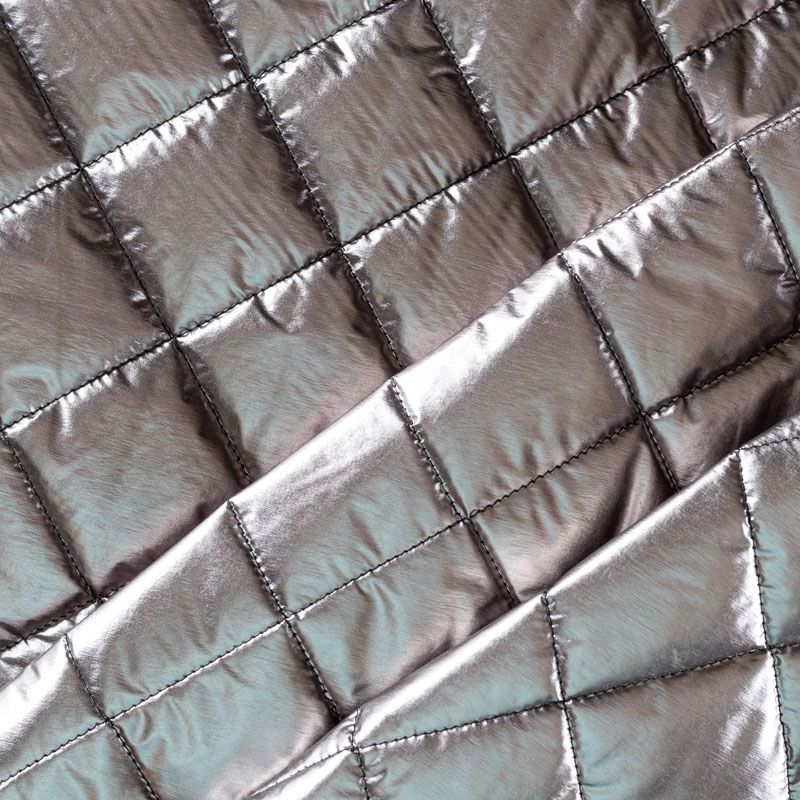 Трехслойная итальянская курточная ткань серебристо-бежевого оттенка с легким эффектом металлик, простеганная не крупными ромбами размером 3х3 см. Нижний, черного цвета, заменяет подклад и верхний слой - полиэстер, по качеству напоминает болонь, между ними синтепон. Ткань легкая, пластичная, хорошо драпируется. Прекрасно подойдет для  пошива легких пальто, курток, бомберов, жилетов, накидок-кейпов, объемных сумок, одежды для домашних питомцев, туристического снаряжения.