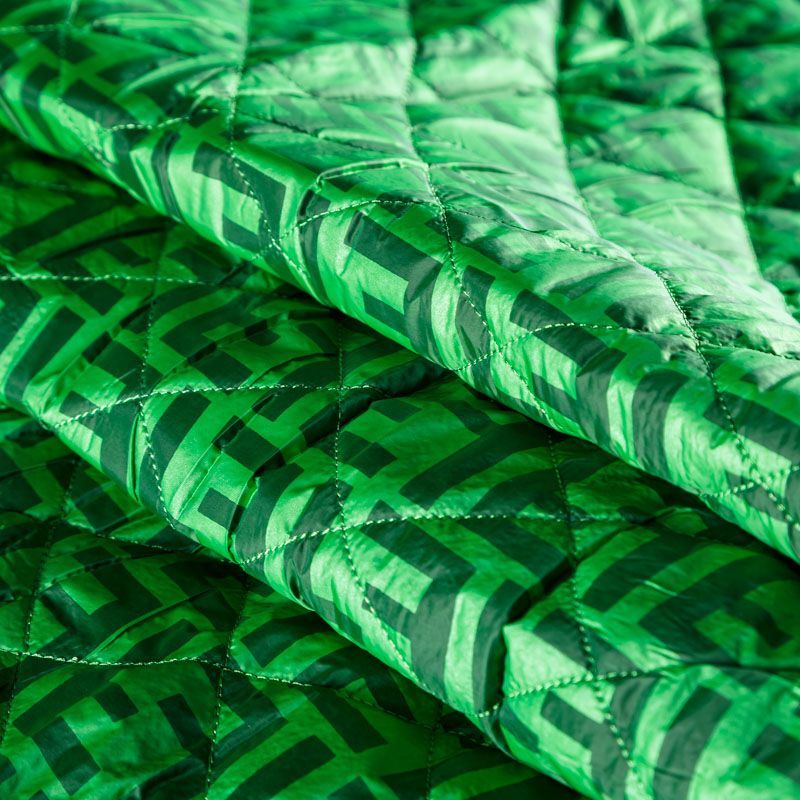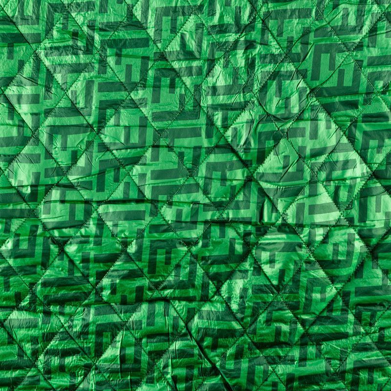 Двухслойная курточная стежка ярко-зеленого оттенка с принтом лого известного бренда, простеганная не крупными ромбами. Нижний слой - синтепон, верхний - полиэстер, по качеству напоминает болонь. Очень мягкая и легкая, пластичная, хорошо драпируется. Прекрасно подойдет для  пошива легких пальто, курток, жилетов, накидок-кейпов, комбинезонов, объемных сумок, одежды для домашних питомцев, туристического снаряжения.