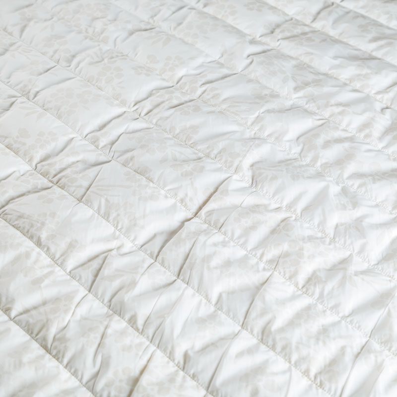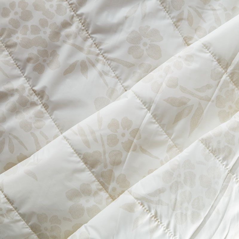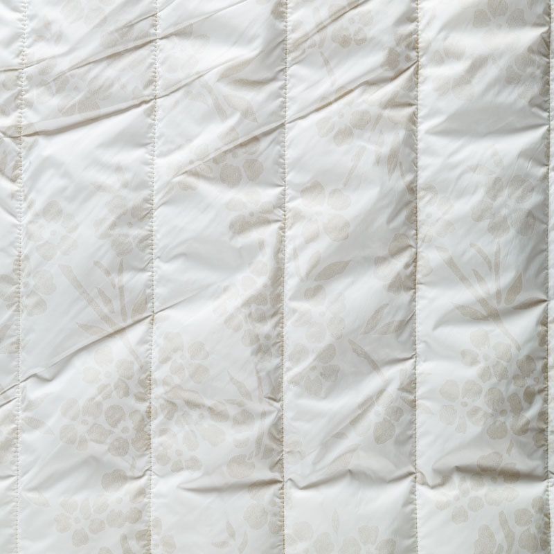 Итальяская двухслойная курточная ткань молочного оттенка, простеганная широкими полосами вдоль кромки. Нижний слой - воздушный синтепоновый утеплитель, верхний - матовая плащевая ткань со стилизованным растительным принтом песочного оттенка. Очень мягкая и легкая, пластичная, хорошо драпируется. Прекрасно подойдет для  пошива легких пальто, бомберов, парки, курток, жилетов, накидок-кейпов, объемных сумок.