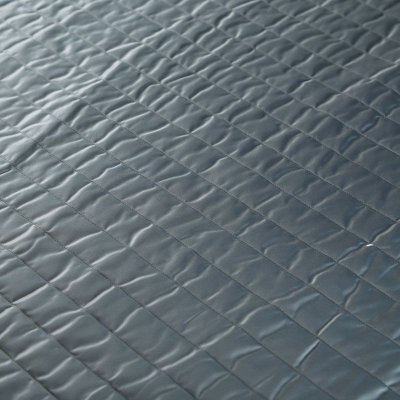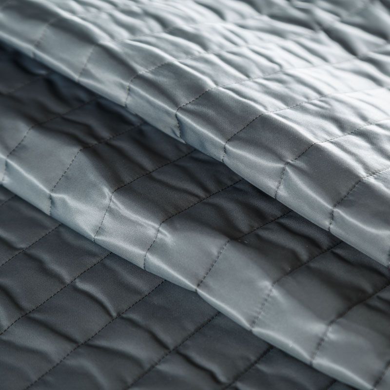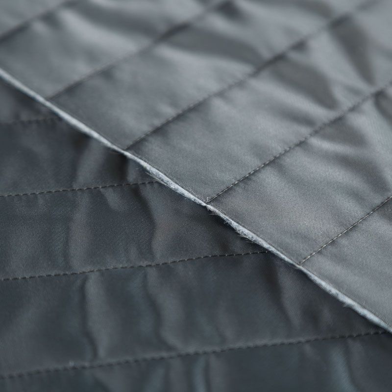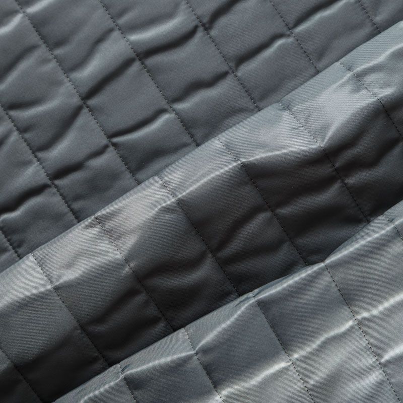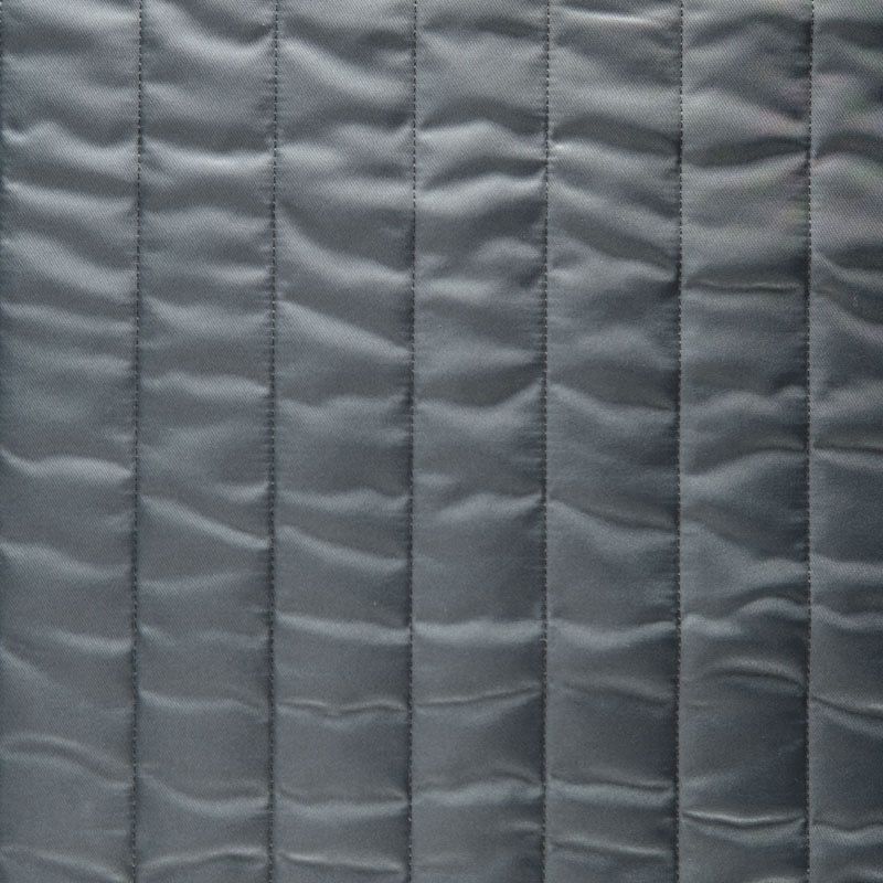 Итальяская трехслойная двухсторонняя курточная ткань грфитового оттенка, простеганная полосами вдоль кромки. Средний слой - тонкий синтепоновый утеплитель, нижний и верхний - матовая плотная плащевая ткань твилового плетения. Стежка хорошо держит форму, пластичная. Прекрасно подойдет для  пошива легких пальто, бомберов, парки, курток, жилетов, накидок-кейпов, объемных сумок.