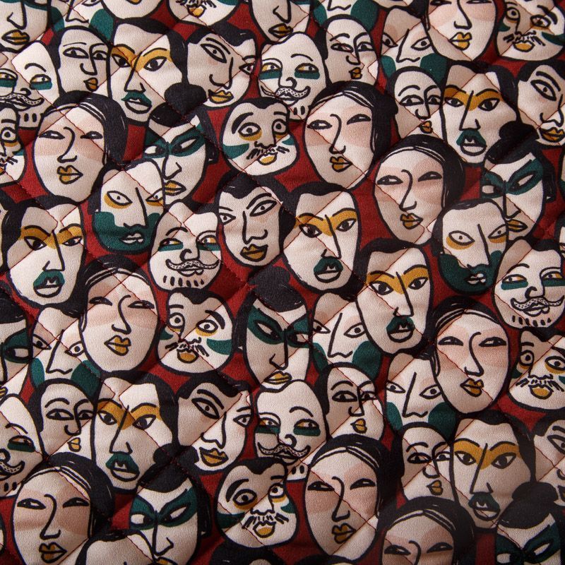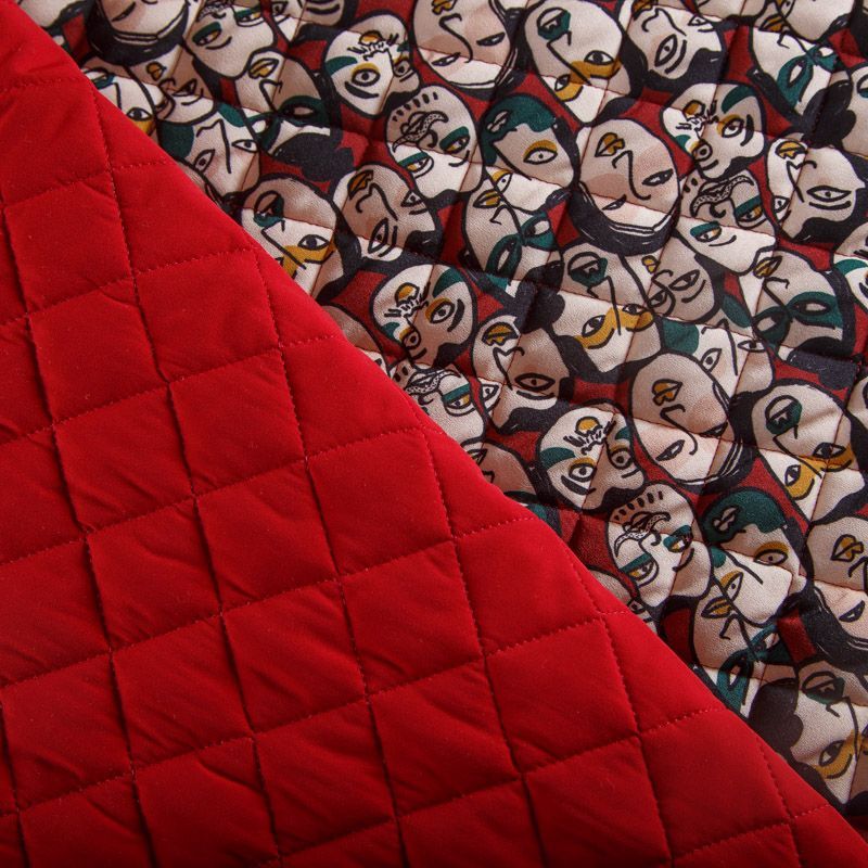 Итальянская трехслойная курточная ткань вишневого оттенка цвета с абстрактным принтом, простеганная ромбами. Нижний слой - гладкий матовый полиэстер красного цвета, средний слой - синтепон, верхний - принтованный креп-шифон. Очень мягкая и легкая, пластичная, хорошо драпируется. Прекрасно подойдет для пошива легких пальто, бомберов, парки, курток, жилетов, накидок-кейпов, объемных сумок.