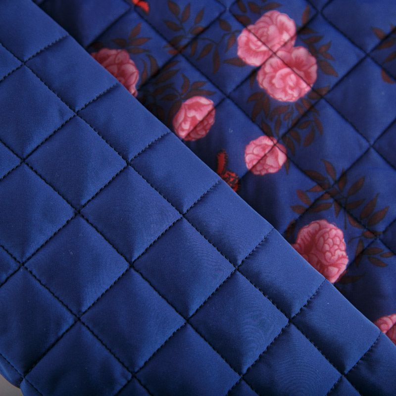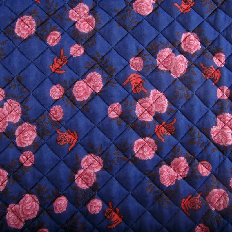 Итальянская трехслойная курточная ткань сапфирового оттенка с ярким принтом, простеганная ромбами. Нижний слой - гладкий матовый полиэстер синего цвета, средний слой - синтепон, верхний - принтованный. Очень мягкая и легкая, пластичная, хорошо драпируется. Прекрасно подойдет для пошива легких пальто, бомберов, парки, курток, жилетов, накидок-кейпов, объемных сумок.