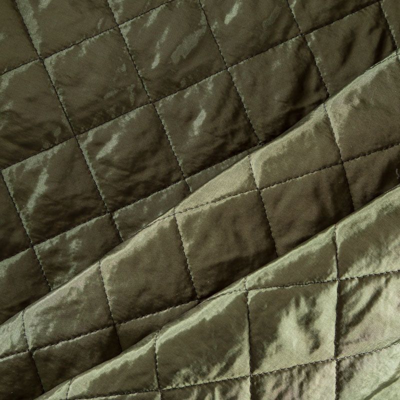 Двухслойная курточная ткань оттенка зеленого хаки с легким блеском, простеганная не крупными ромбами размером 3х3 см. Нижний слой - синтепон, верхний - полиэстер, по качеству напоминает болонь. Очень мягкая и легкая, пластичная, хорошо драпируется. Прекрасно подойдет для пошива легких пальто, курток, жилетов, накидок-кейпов, объемных сумок.