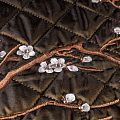 Курточный купон на синтепоне и подкладке, простеганный не крупными ромбами размером 3,5х3,5 см. С лицевой стороны тонкая, но прочная плащевая ткань с вышивкой в виде цветущей ветки сакуры, с изнаночной - однотонная ткань желтого цвета. Материал мягкий, объемный и "воздушный", хорошо держит форму и подойдет для пошива легких пальто, курток, жилетов, накидок-кейпов, парки.