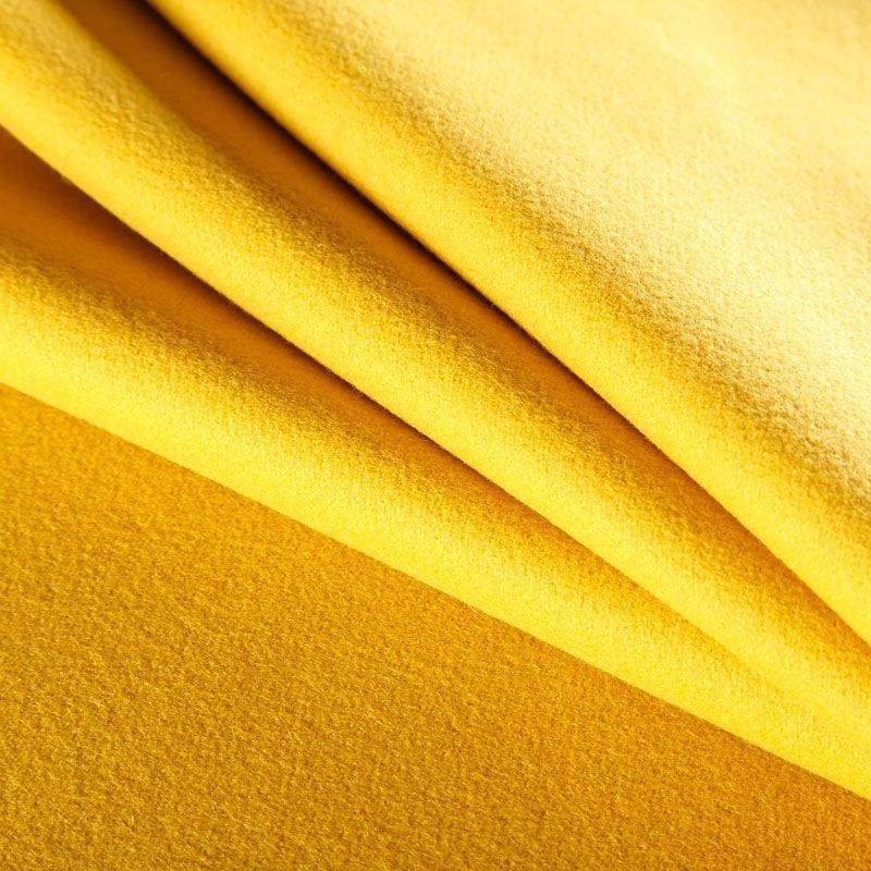 Пальтовая итальянская шерсть в красивом шафрановом оттенке. Ткань плотная, достаточно теплая, комфортная для одежды на сезон осень-зима. Полотно имеет короткий ворс. Мягкое и нежное на ощупь, не толстое и не тяжелое, хорошо держит форму. Прекрасно подойдет для пошива женских пальто, теплых костюмов, кейпов, мягких бомберов, жилетов и головных уборов.