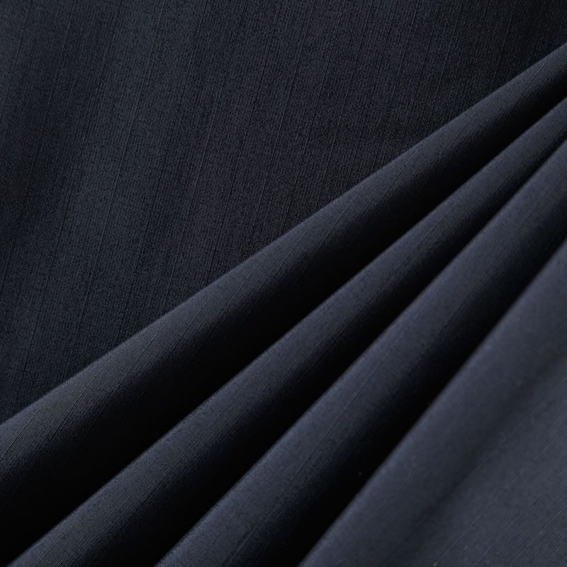 Плотная прочная черная плащевая ткань с полиуретановым белым покрытием с изнаночной стороны. Поверхность ткани рельефная в еле заметную мелкую клеточку. Подходит для изготовления  плащей, курток, ветровок, бомберов, одежды для домашних питомцев, туристического снаряжения.