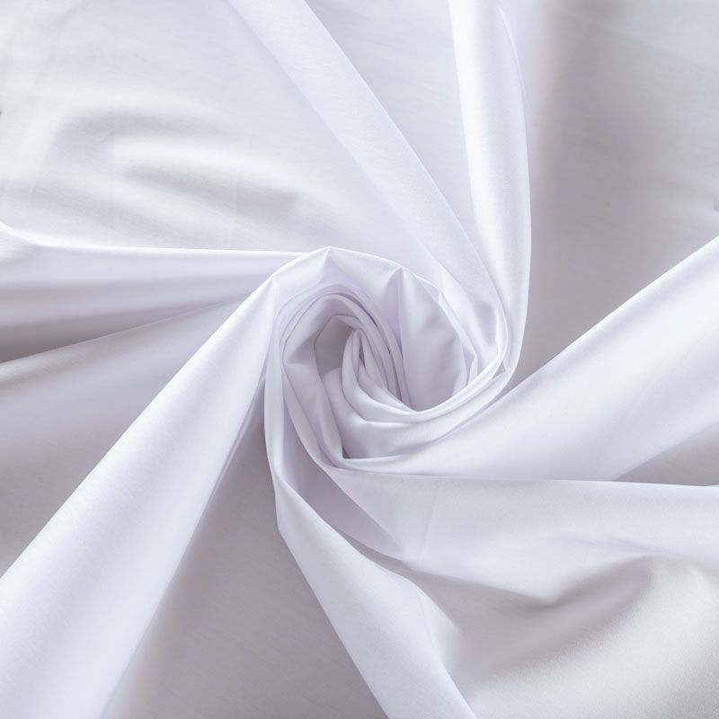 Плательно-рубашечная смемовая ткань белого цвета. Ткань мягкая, лёгкая, непрозрачная, пластичная и приятная к телу, хорошо драпируется, тянется за счет эластана в составе, имеет гладкую матовую поверхность и сатиновое плетение. Прекрасно подойдет как для пошива платья-рубашки, сарафана, платьев различных фасонов, туники, топа, рубашки, блузы, летнего костюма, комбинезона.