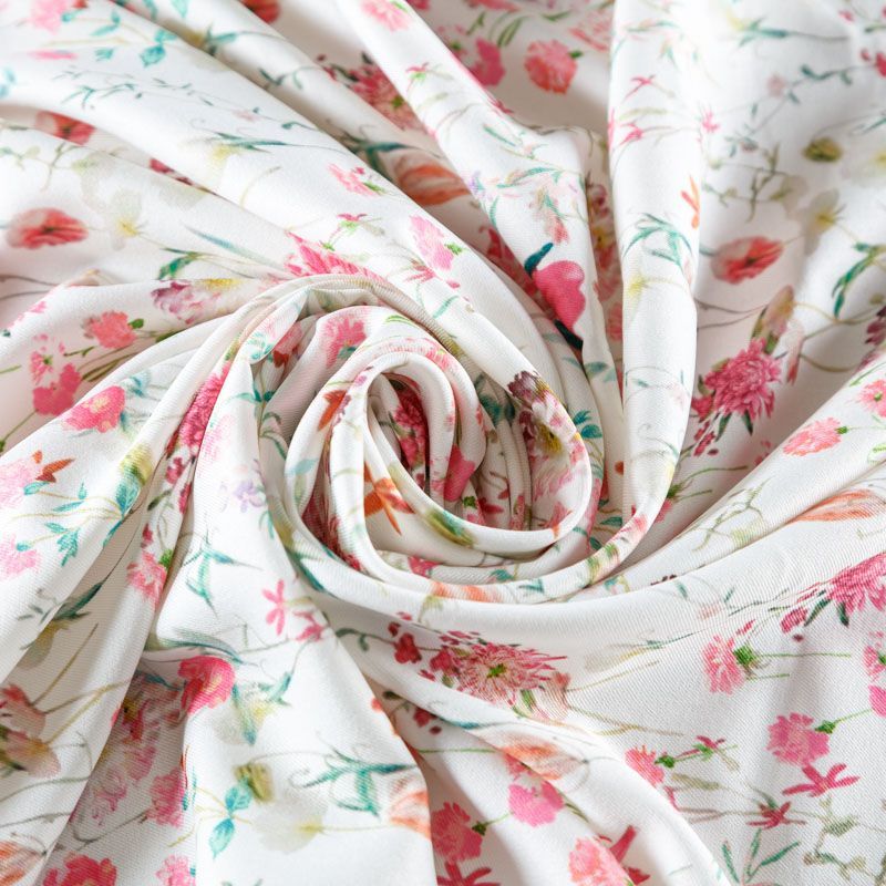 Плательно-блузочная ткань в молочном оттенке с цветочным принтом. Ткань мягкая, лёгкая, непрозрачная, пластичная и приятная к телу, хорошо драпируется, имеет гладкую матовую поверхность. Прекрасно подойдет как для пошива платья, сарафана, блузки, туники, топа, летнего костюма, комбинезона.