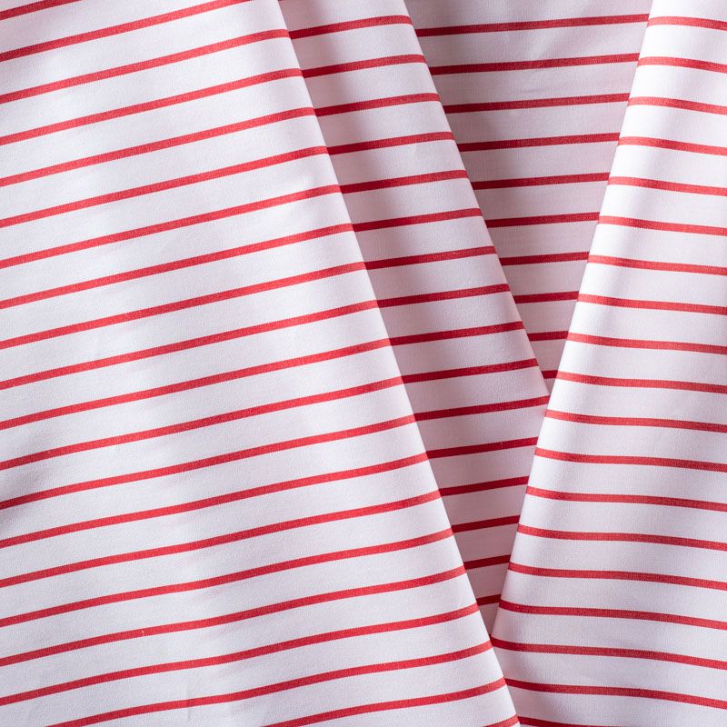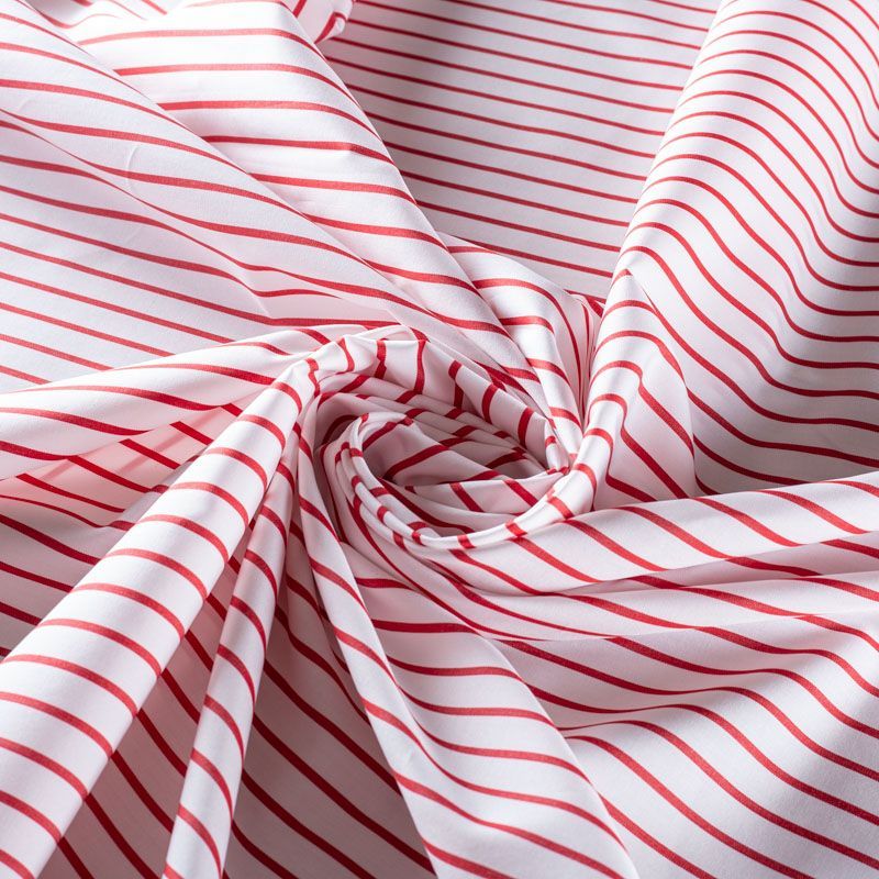 Итальянский плательно-рубашечный хлопок белого цвета в тонкую красную полоску. Ткань мягкая, лёгкая, непрозрачная, пластичная и приятная к телу, хорошо драпируется, имеет гладкую матовую поверхность и сатиновое плетение. Прекрасно подойдет как для пошива платья-рубашки, сарафана, платьев различных фасонов, туники, топа, летнего костюма, комбинезона.