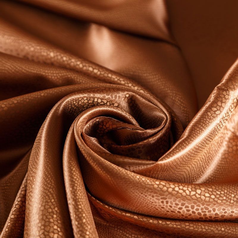 Итальянская подкладочная ткань из вискозы коричневого оттенка с жаккардовым анималистичным узором и красивым лоском. Полотно средней плотности, легкое, не просвечивает, хорошо скользит, не тянется. Подойдет для изготовления таких изделий, как пальто, костюмы, куртка, шуба, платье, жакет.