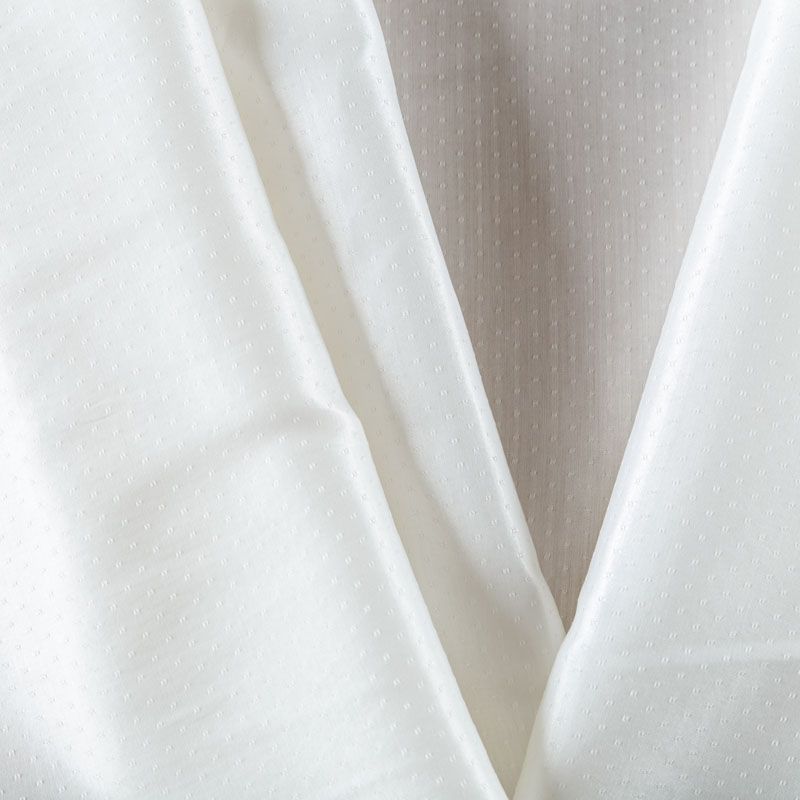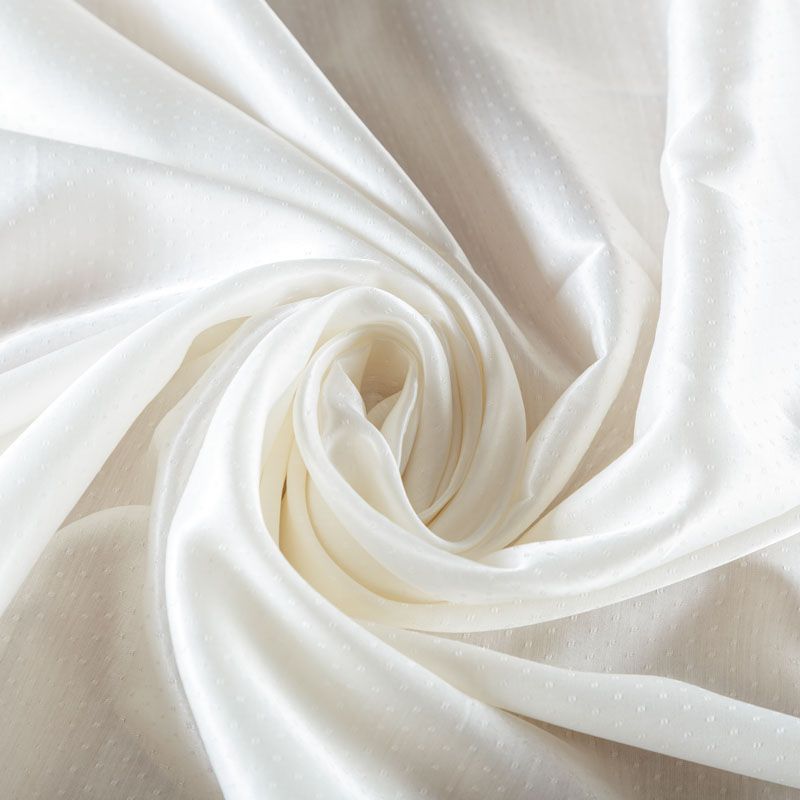 Итальянская подкладочная ткань из вискозы молочного оттенка с мелким жаккардовым узором и красивым лоском. Полотно средней плотности, легкое, не просвечивает, хорошо скользит, не тянется. Подойдет для изготовления таких изделий, как пальто, костюмы, куртка, шуба, платье, жакет.