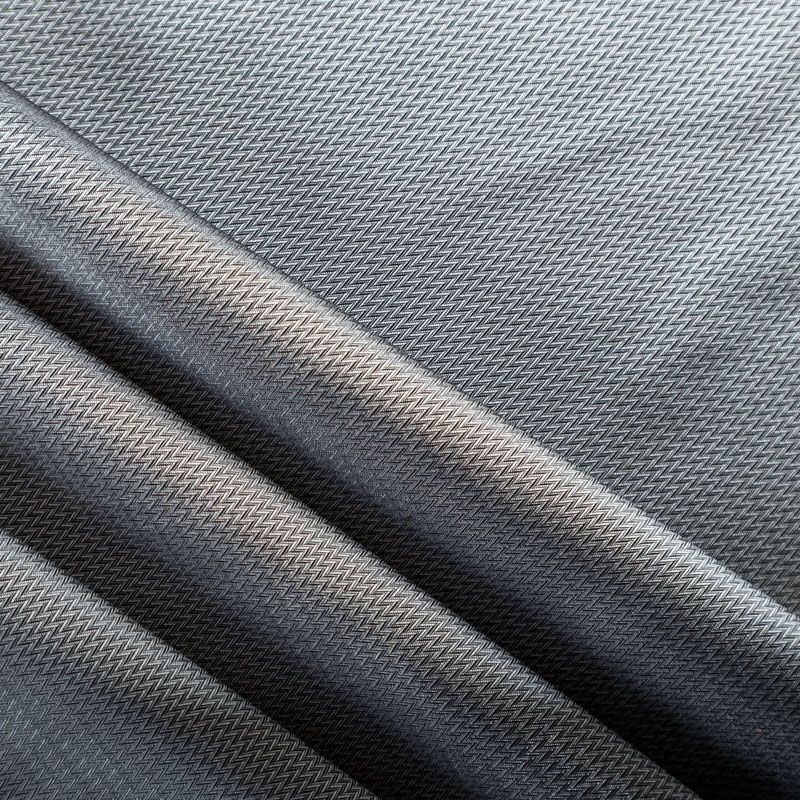 Смесовая подкладочная ткань серебристо-серого оттенка с жаккардовым геометрическим узором и красивым лоском. Полотно средней плотности, легкое, не просвечивает, хорошо скользит, не тянется. Подойдет для изготовления таких изделий, как пальто, костюмы, куртка, шуба, платье, жакет.