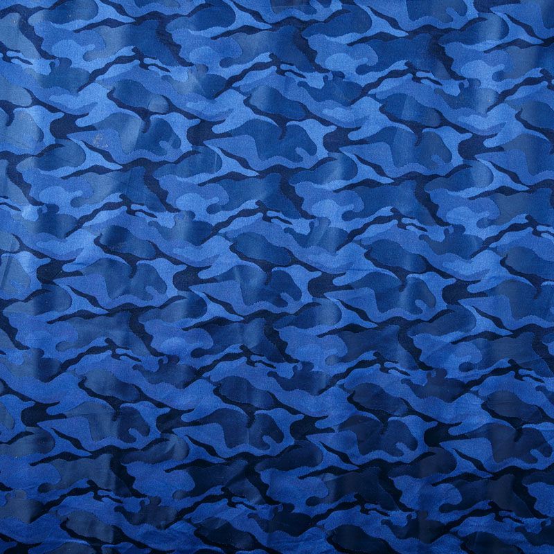 Смесовая подкладочная ткань синего оттенка с жаккардовым камуфляжным узором и красивым лоском. Полотно средней плотности, легкое, не просвечивает, хорошо скользит, не тянется. Подойдет для изготовления таких изделий, как пальто, костюмы, куртка, шуба, платье, жакет.
