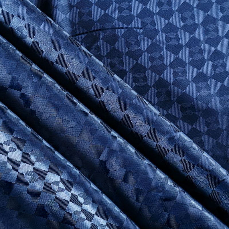 Смесовая подкладочная ткань синего оттенка с жаккардовым геометрическим узором и красивым лоском. Полотно средней плотности, легкое, не просвечивает, хорошо скользит, не тянется. Подойдет для изготовления таких изделий, как пальто, костюмы, куртка, шуба, платье, жакет.