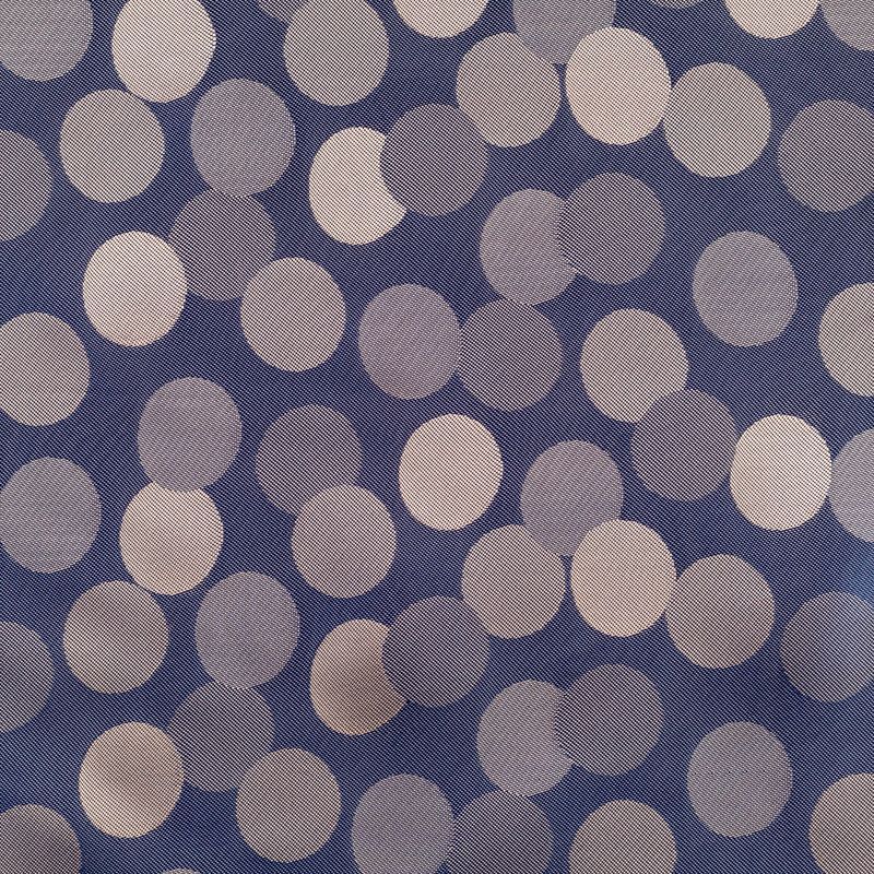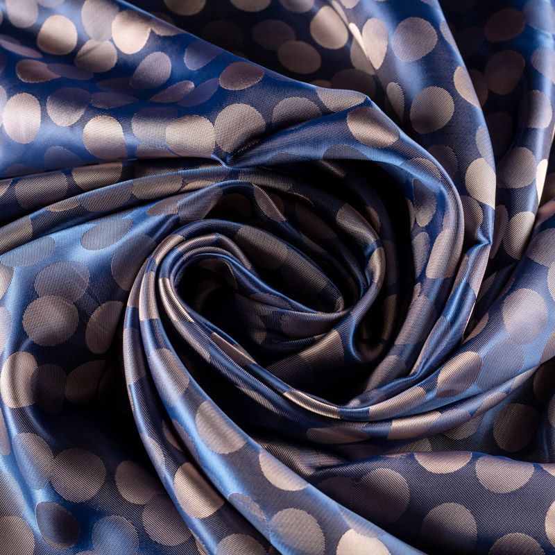 Подкладочная ткань легкая, с жаккардовым крупным "горохом",  сине-фиолетового оттенка, с красивым блеском. Не  просвечивает, хорошо скользит. Подойдет для изготовления таких изделий, как пальто, костюмы, куртка, шуба, платье, жакет.