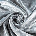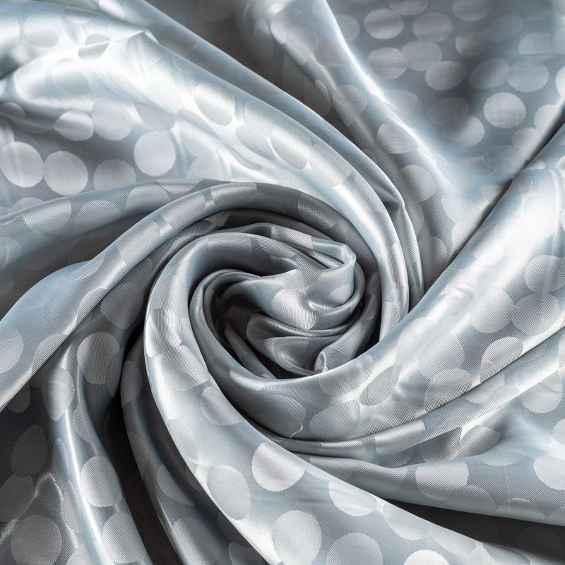 Подкладочная ткань легкая, с жаккардовым крупным "горохом", серебристо-серого оттенка, с красивым блеском. Не просвечивает, хорошо скользит. Подойдет для изготовления таких изделий, как пальто, костюмы, куртка, шуба, платье, жакет.