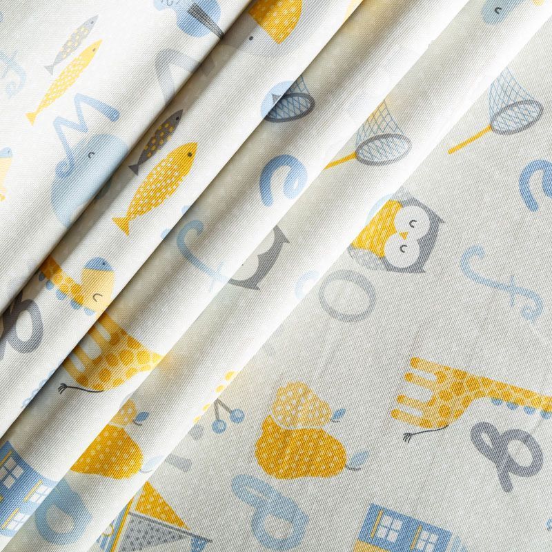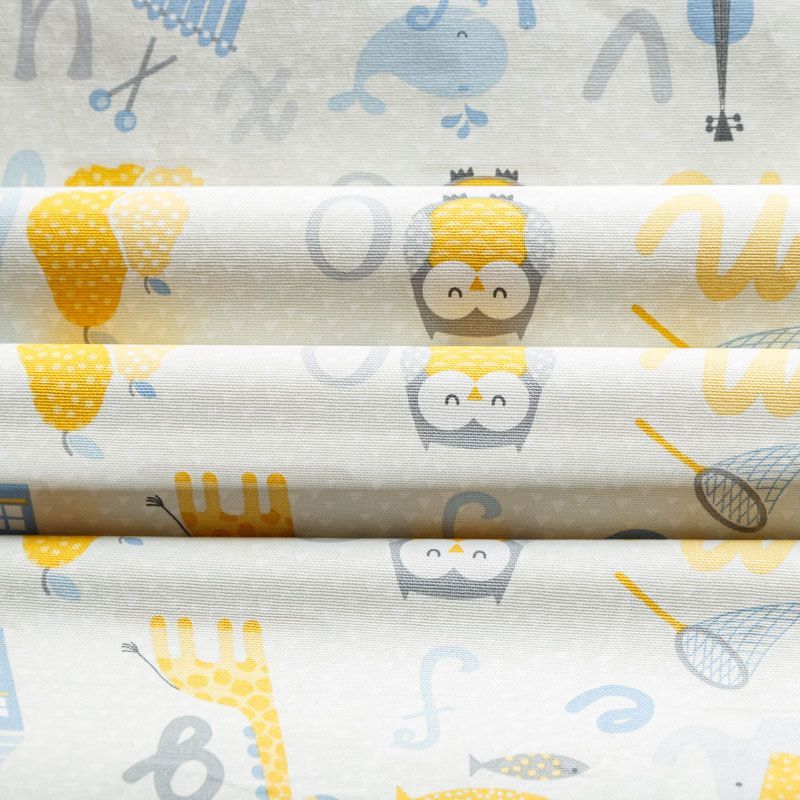 Натуральная хлопковая портьерная ткань с милым ярким принтом в виде милых зверушек, игрушек и латинских букв. Ткань средней плотности, без блеска, хорошо драпируется, имеет полонтяное переплетение. Прекрасно подойдет для оформления детской или дачного интерьера. Можно использовать для пошива портьер, римской шторы, салфеток, столового белья, подушек, покрывал, обивки мебели.