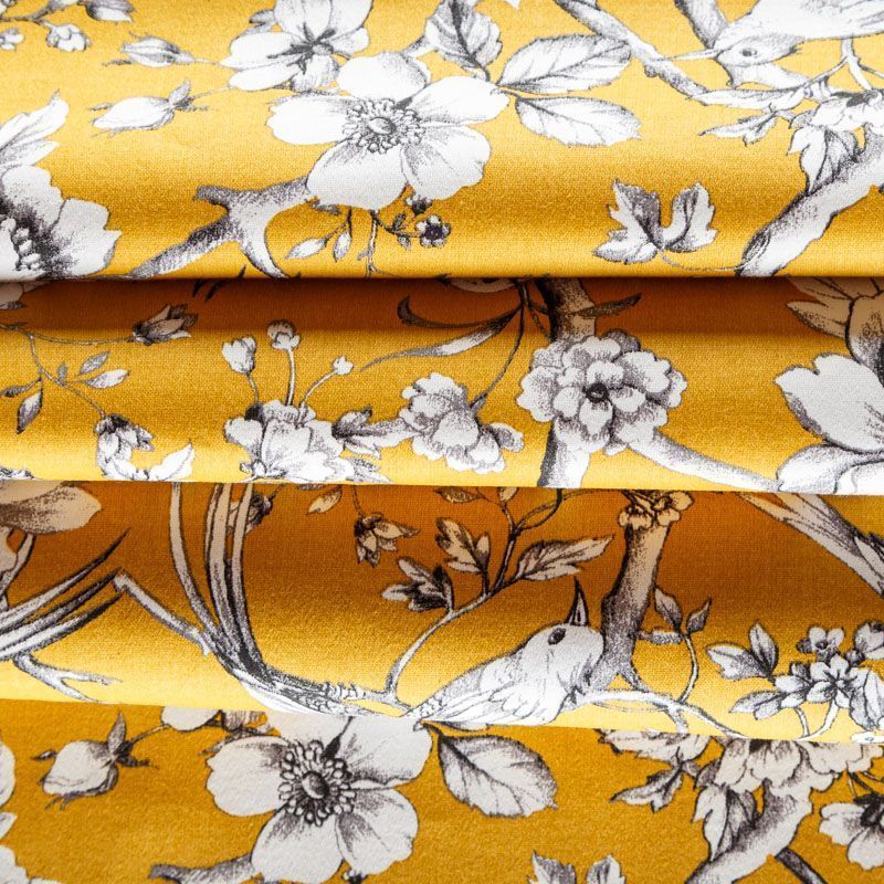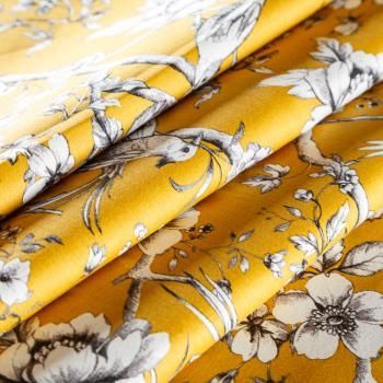 Хлопковая портьерная ткань от английского производителя. На  текстурированной основе цвета охры наснесен принт в виде белых птиц и цветов. Ткань средней плотности, прекрасно держит форму, драпируется в устойчивые складки. Подойдет для классических портьер, римских штор, покрывал, подушек, скатертей, салфеток и других элементов текстильного интерьера как в самостоятельном исполнении, так и качестве компаньона к однотонным варинтам.