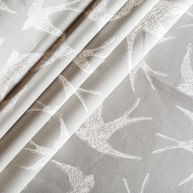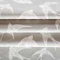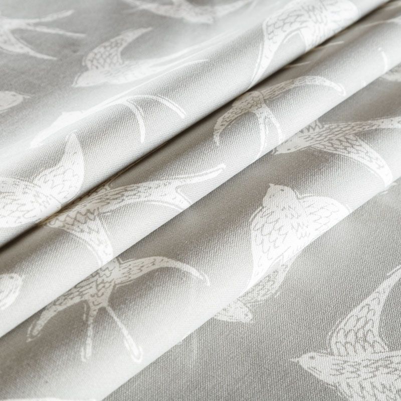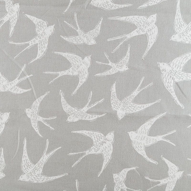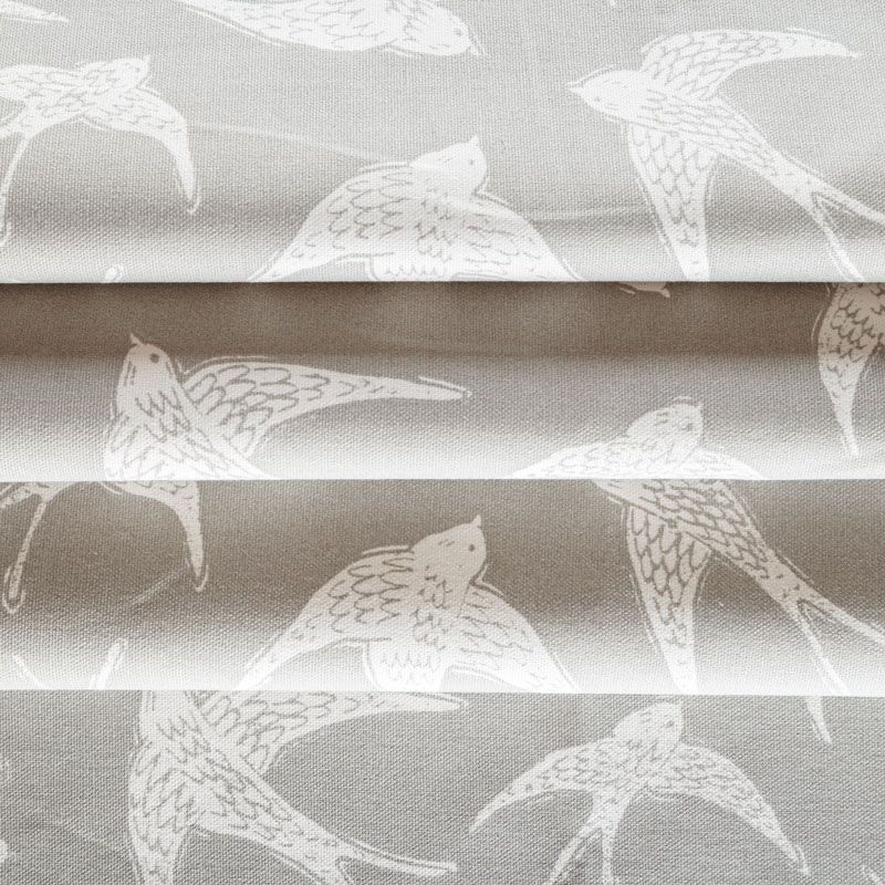 Матовая фактурная портьерная ткань серого оттенка с весенним принтом в виде ласточек. Ткань средней плотности, без блеска, хорошо драпируется, имеет полонтяное переплетение. Прекрасно впишется в самые разные стилевые направления (прованс, кантри). Можно использовать для пошива портьер, римской шторы, салфеток, столового белья, подушек, покрывал и других предметов текстильного интерьера.