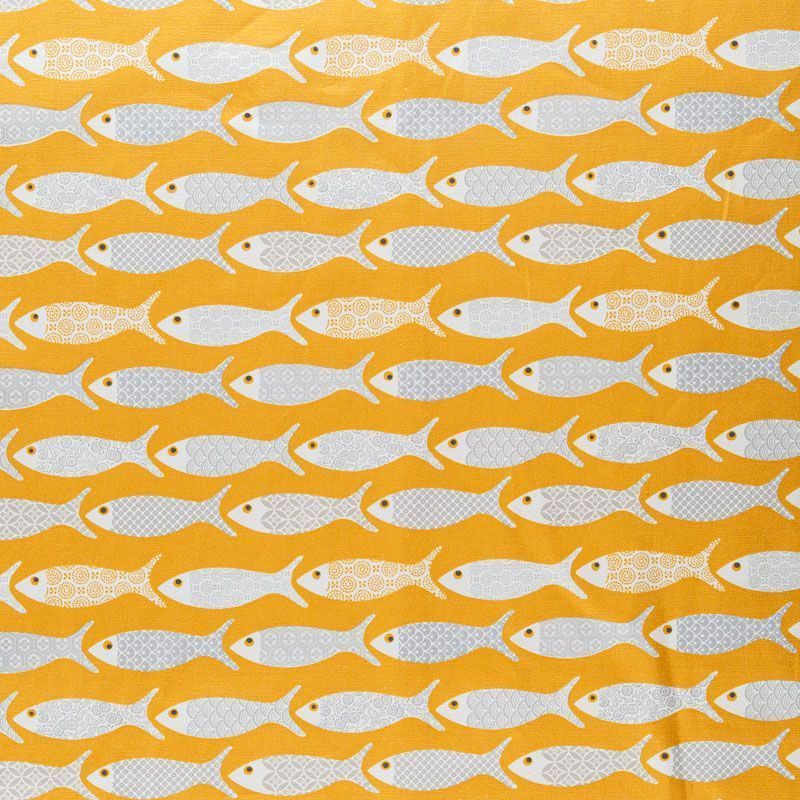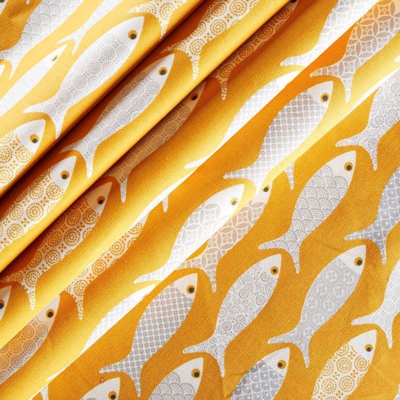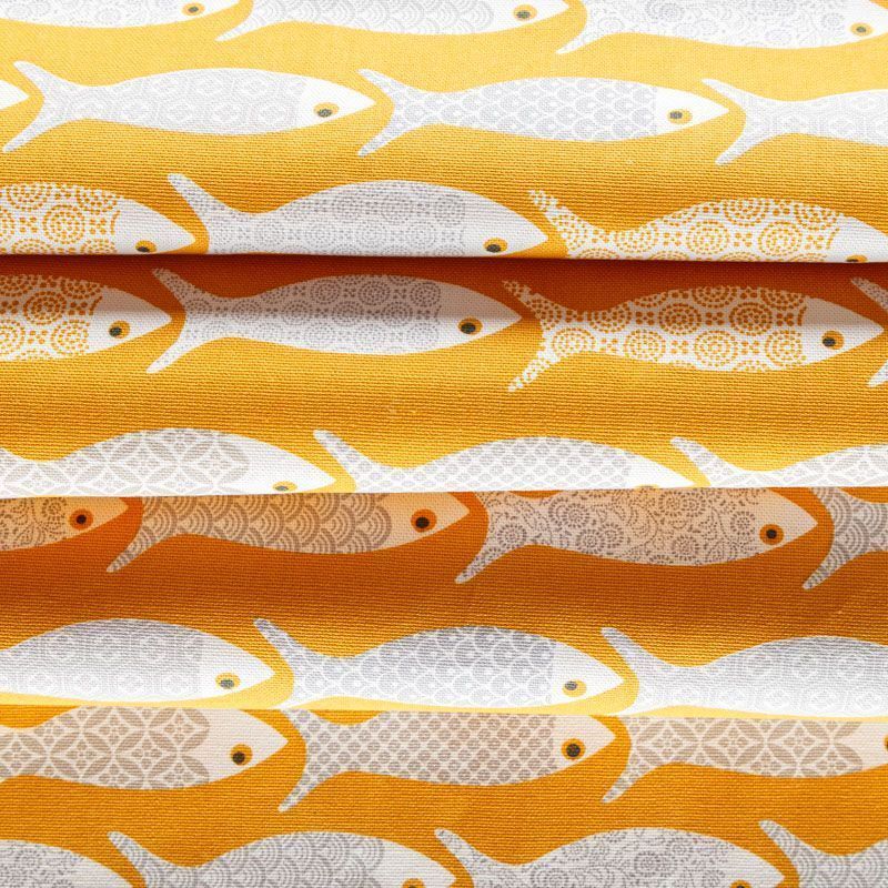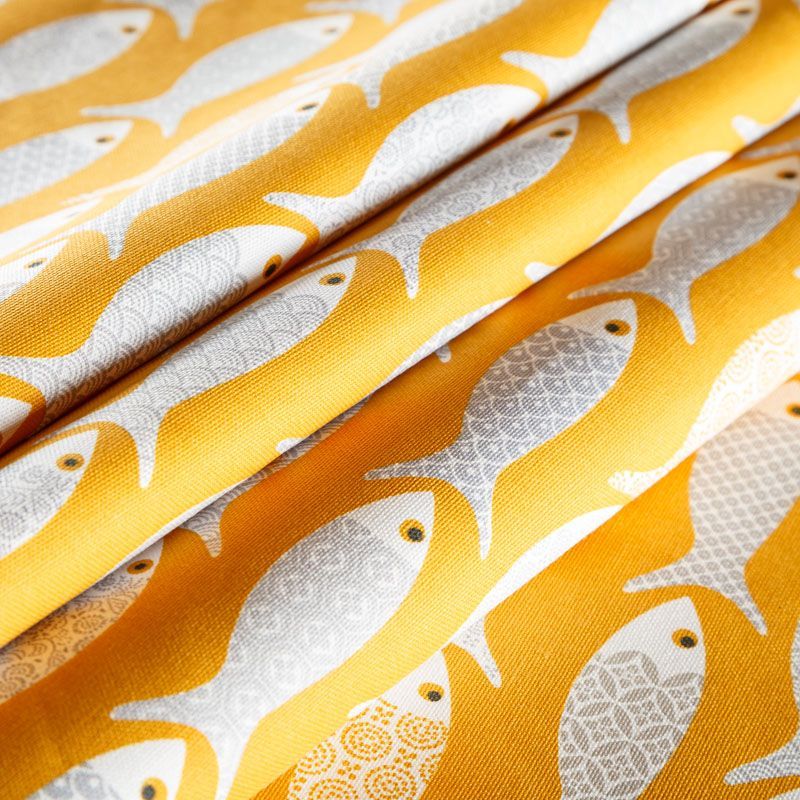 Матовая фактурная портьерная ткань желтого оттенка с монохромными рыбками. Ткань средней плотности, без блеска, хорошо драпируется, имеет полонтяное переплетение. Прекрасно впишется в самые разные стилевые направления (прованс, кантри). Можно использовать для пошива портьер, римской шторы, салфеток, столового белья, подушек, покрывал и других предметов текстильного интерьера.