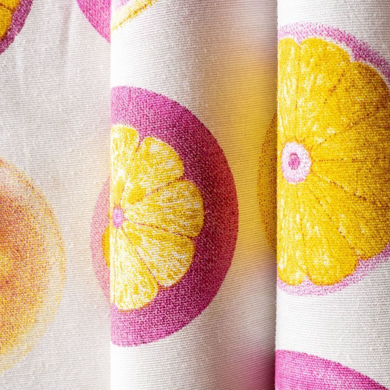 Принтованная ткань с фантазийным дизайном, выполненным на смесовой основе. Ткань подходит для оформления интерьеров в современном стиле. Яркие фрукты, выполненные в розово-желтых оттенках представлены на рубчатой плотной основе полотняного плетения. Ткань подойдет для пошива портьер, римской шторы, покрывала, чехлов для мебели, скатертей, салфеток, подушек.