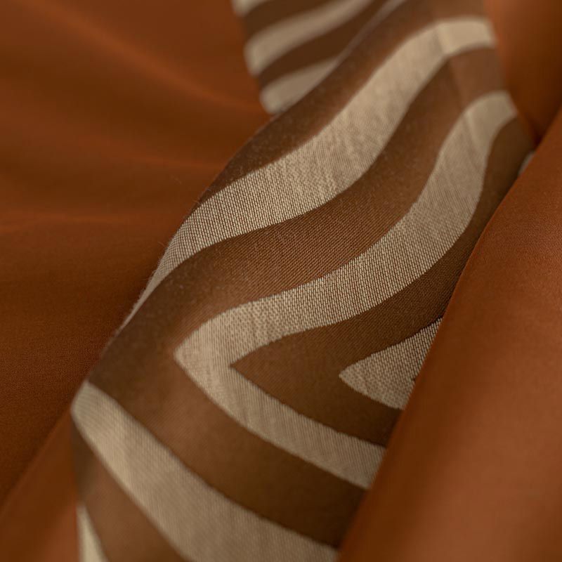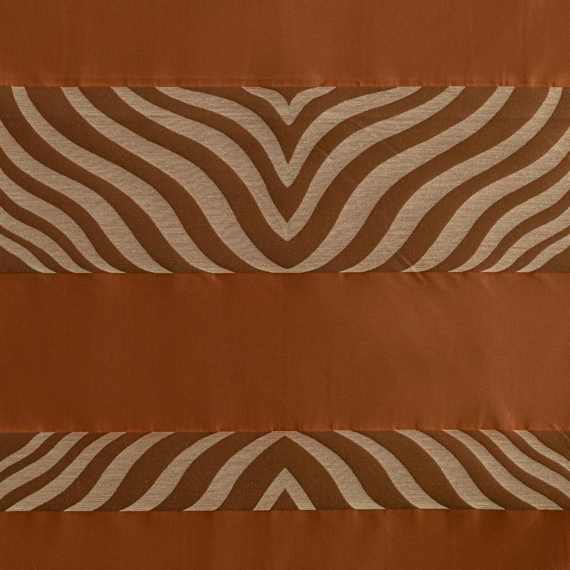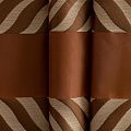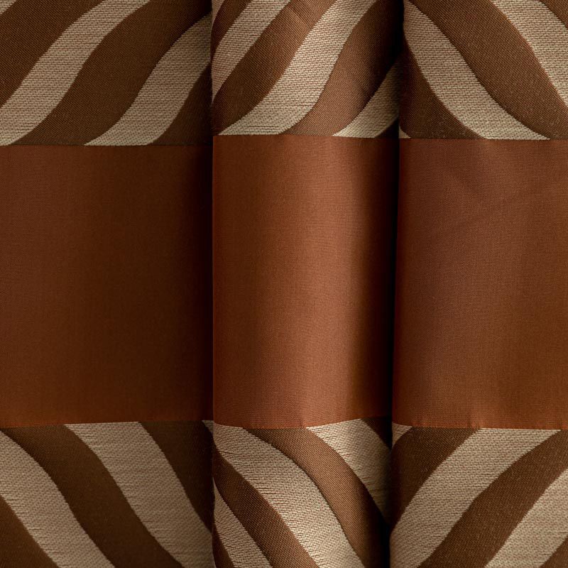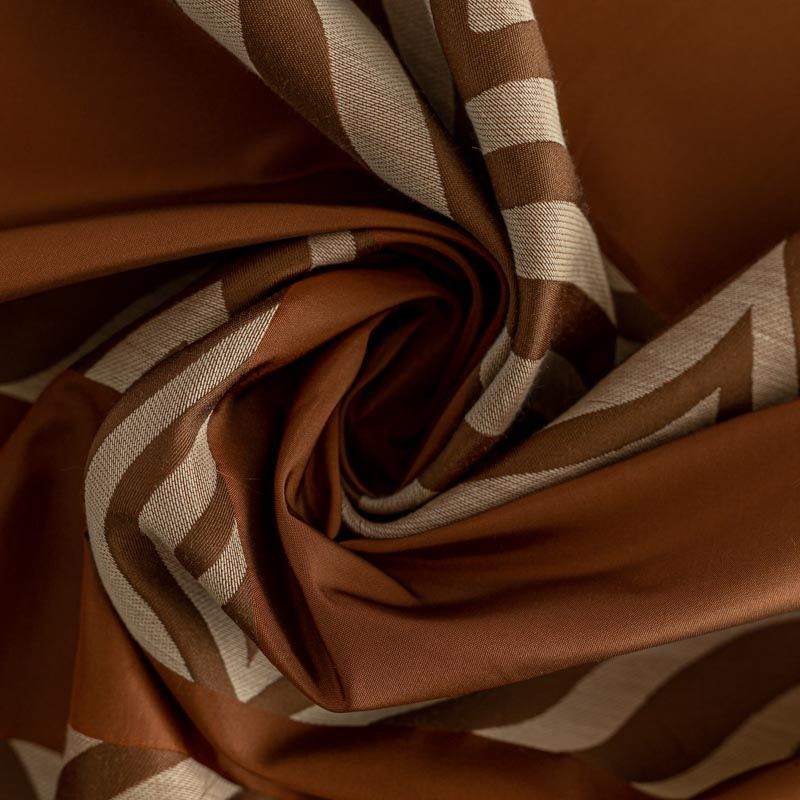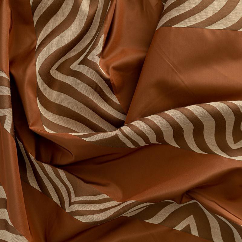 По своей структуре шелковые портьерные ткани являются мягким и красивым материалом, способным отражать свет. Изделия из шелка удивительно переливаются и блестят, придавая интерьеру помещения особую атмосферу и вид. Такие портьерные ткани лучше всего применять для создания покрывал, наволочек, штор, легких, воздушных и светлых – они отлично подойдут для затемненных мест либо закрытых окон. Ткань имеет вертикальные полосы в разных оттенках терракотового и коричневого цветов, а так же сочетает в себе чередование полос матовой и блестящей текстур.