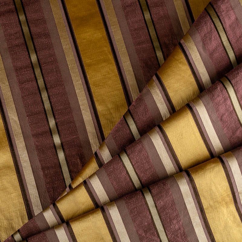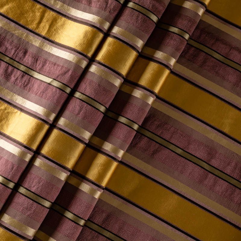 По своей структуре шелковые портьерные ткани являются мягким и красивым материалом, способным отражать свет. Изделия из шелка удивительно переливаются и блестят, придавая интерьеру помещения особую атмосферу и вид. Такие портьерные ткани лучше всего применять для создания покрывал, наволочек, штор, легких, воздушных и светлых. Ткань имеет вертикальные полосы в разных оттенках золотистого цвета, а так же сочетает в себе чередование полос матовой и блестящей текстур.