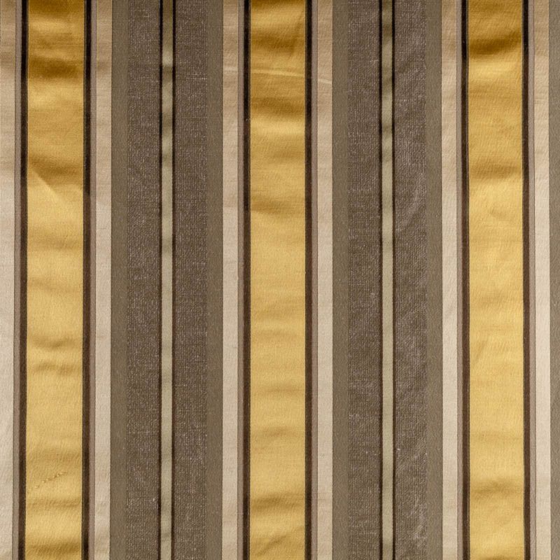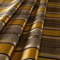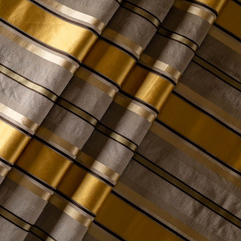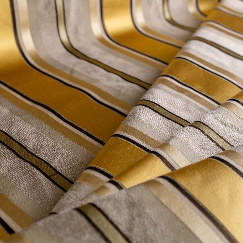 По своей структуре шелковые портьерные ткани являются мягким и красивым материалом, способным отражать свет. Изделия из шелка удивительно переливаются и блестят, придавая интерьеру помещения особую атмосферу и вид. Такие портьерные ткани лучше всего применять для создания покрывал, наволочек, штор, легких, воздушных и светлых – они отлично подойдут для затемненных мест либо закрытых окон. Ткань имеет вертикальные полосы в разных оттенках золотисто-бежевого цвета, а так же сочетает в себе чередование полос матовой и блестящей текстур.