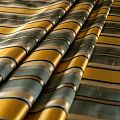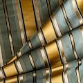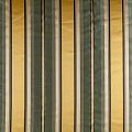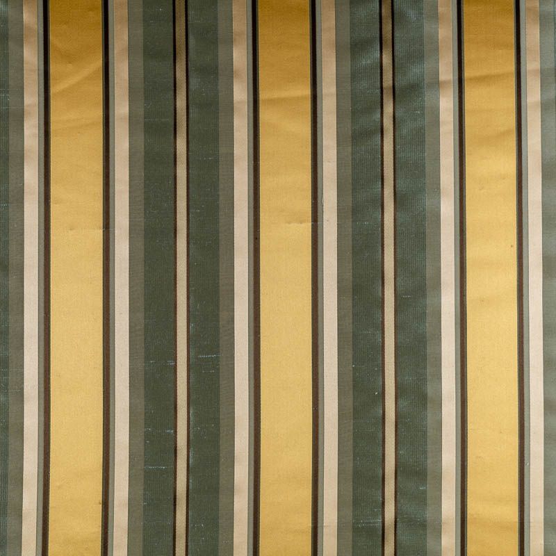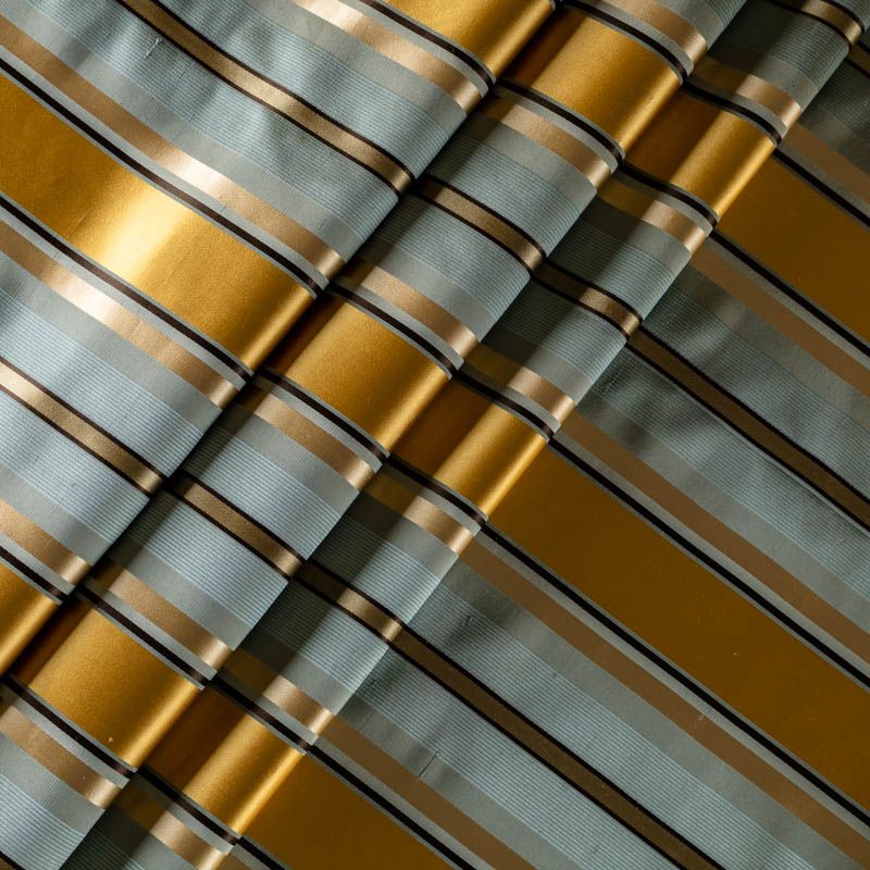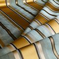 По своей структуре шелковые портьерные ткани являются мягким и красивым материалом, способным отражать свет. Изделия из шелка удивительно переливаются и блестят, придавая интерьеру помещения особую атмосферу и вид. Такие портьерные ткани лучше всего применять для создания покрывал, наволочек, штор, легких, воздушных и светлых – они отлично подойдут для затемненных мест либо закрытых окон. Ткань имеет вертикальные полосы в разных оттенках золотистого и ментолового цветов, а так же сочетает в себе чередование полос матовой и блестящей текстур.