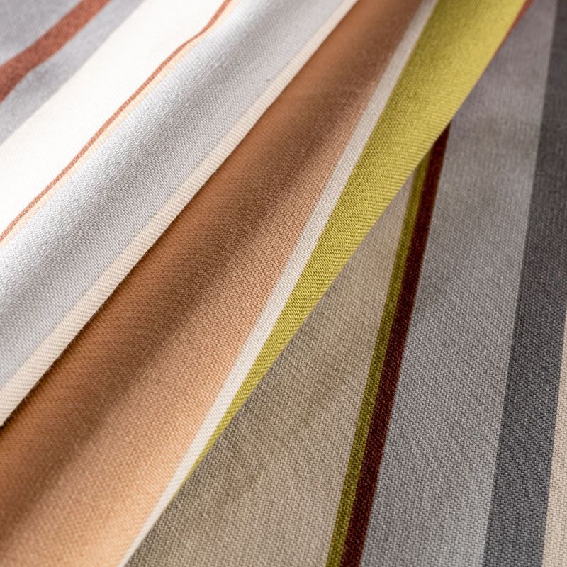 Испанская матовая фактурная портьерная ткань в полоску, которая расположена вдоль кромки. Представлена в палитре пастельных тонов. Ткань очень приятная на ощупь за счёт хлопка в составе и очень универсальная, прекрасно впишется в самые разные стилевые направления (прованс, кантри). Можно использовать для пошива портьер, римской шторы, салфеток, столового белья, подушек, покрывал, обивки мебели.