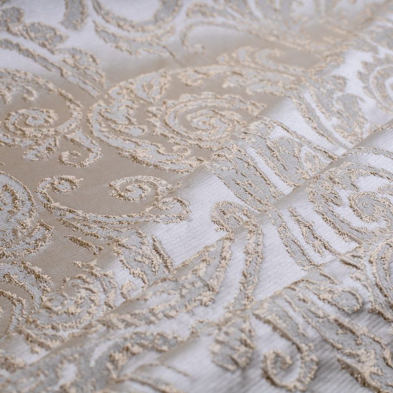 Итальянский жаккард представлен в классических золотисто-молочных оттенках и украшен изящными объемными узорами, традиционными для викторианской эпохи. Ткань роскошно смотрится на массивных гардинах, гармонично вписывается в классические интерьеры. Жаккард высочайшего качества прослужит не один год, придавая интерьеру эксклюзивности.
