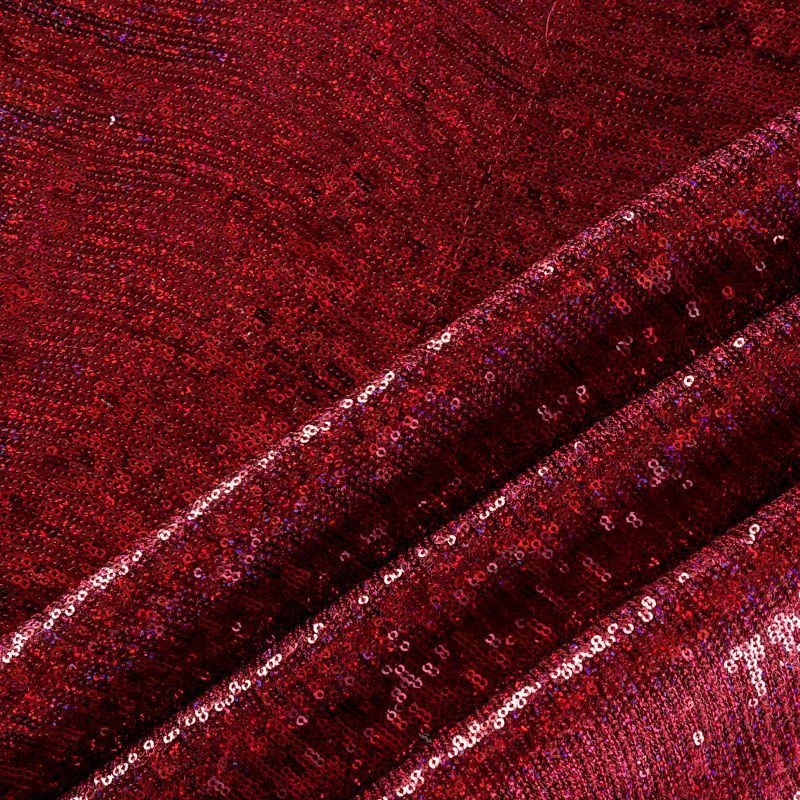 Эластичная сетка бордового оттенка по всей поверхности которой расположены глянцевые пайетки. Ткань очень хорошо драпируется, красиво переливается, имеет глянцевый блеск, пластичная, полоски расположены вдоль кромок, которые обработаны вышитым фигурным фестоном, набирается объемом,  Пайетки — идеальный материал для праздников и вечеринок. Из них получится эффектное платье, жакет, боди, туника, юбка или комбинезон.