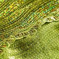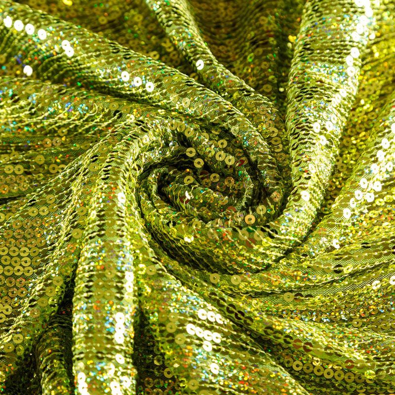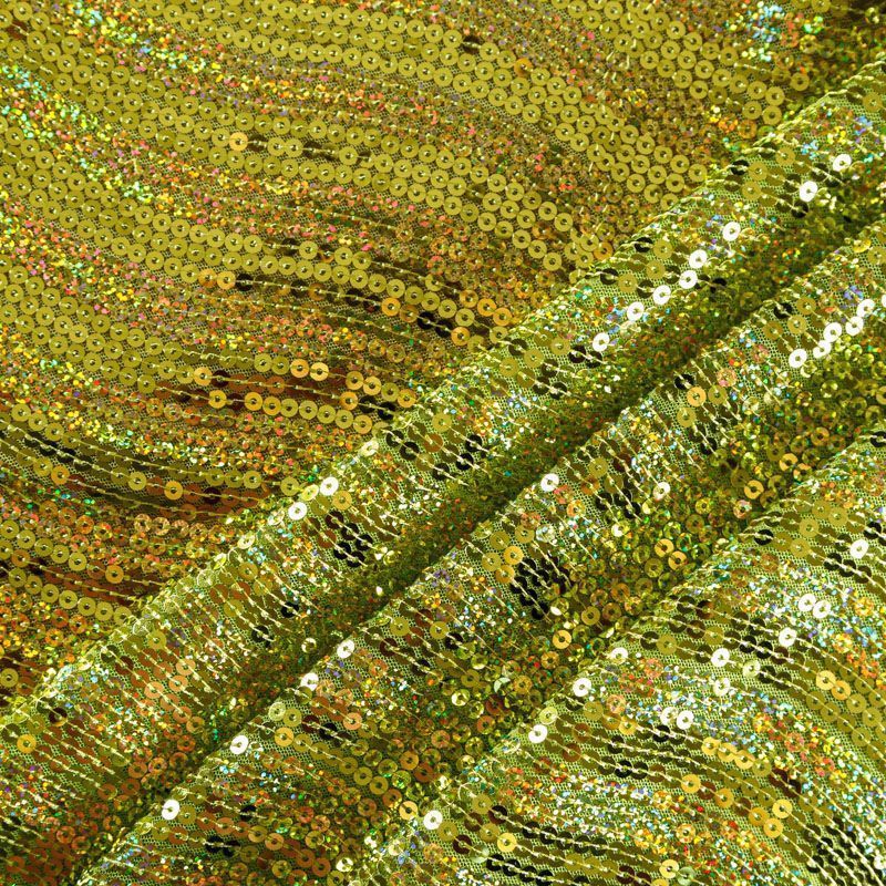 Эластичная сетка желто-зеленого оттенка по всей поверхности которой расположены глянцевые пайетки. Ткань очень хорошо драпируется, красиво переливается, имеет глянцевый блеск, пластичная, полоски расположены вдоль кромок, которые обработаны вышитым фигурным фестоном, набирается объемом,  Пайетки — идеальный материал для праздников и вечеринок. Из них получится эффектное платье, жакет, боди, туника, юбка или комбинезон.