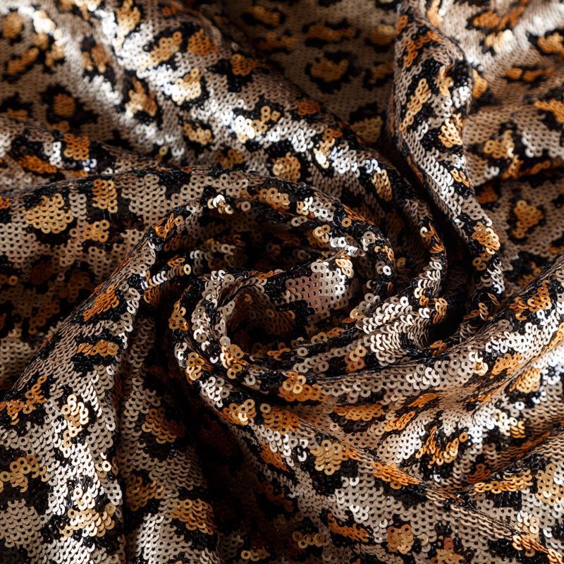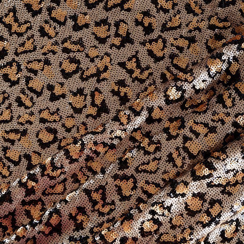 Пайетки с анималистическим узором в золотисто-черной гамме. Вышиты на черной эластичной сетке. Роскошно смотрится в блестящих нарядных комбинезонах, сверкающих платьях и искрящихся блузках, юбках, туниках, концертных костюмах, нарядах для танцев.  На ощупь полотно не тяжелое, достаточно пластичное и удобное в носке.