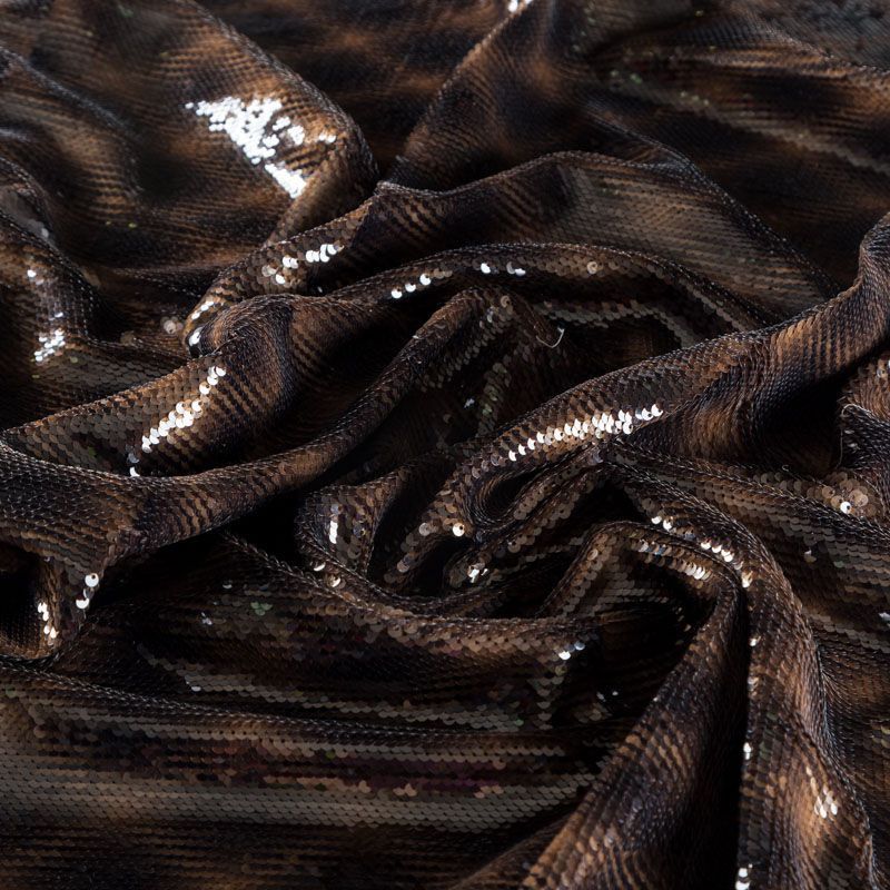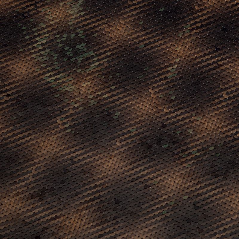 Мелкие глянцевые пайетки на плотной трикотажной основе образуют геометрический двухцветный орнамент. Ткань не просвечивается, пластичная, хорошо драпируется. Идеальный вариант для праздничных и вечерних образов: платья, костюма, юбки, широких брюк, топа, туники, а также для одежды в стиле спорт-шик.