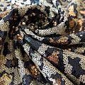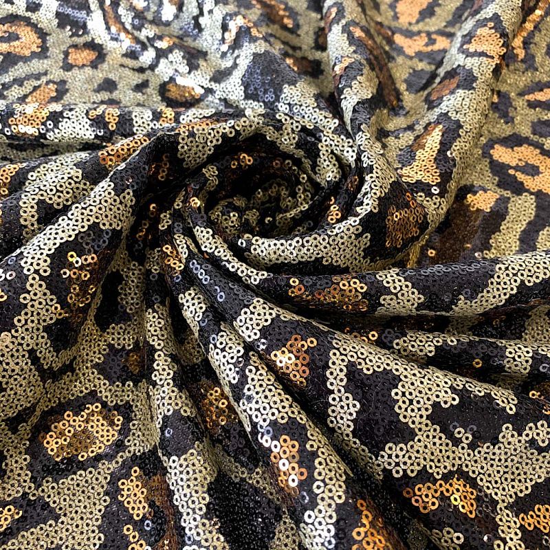 Пайетки в виде золотой шкуры леопарда с блестками. Вышиты на черной эластичной сетке. Роскошно смотрится в блестящих нарядных комбинезонах, сверкающих платьях и искрящихся блузках, юбках, туниках, концертных костюмах, нарядах для танцев. На ощупь полотно не тяжелое, достаточно пластичное и удобное в носке.