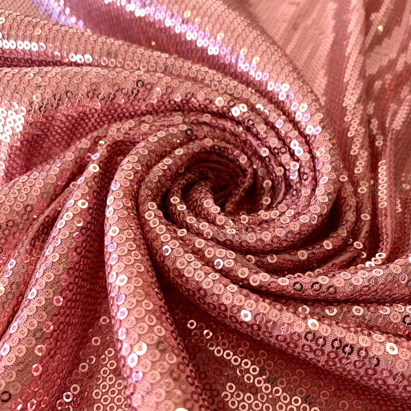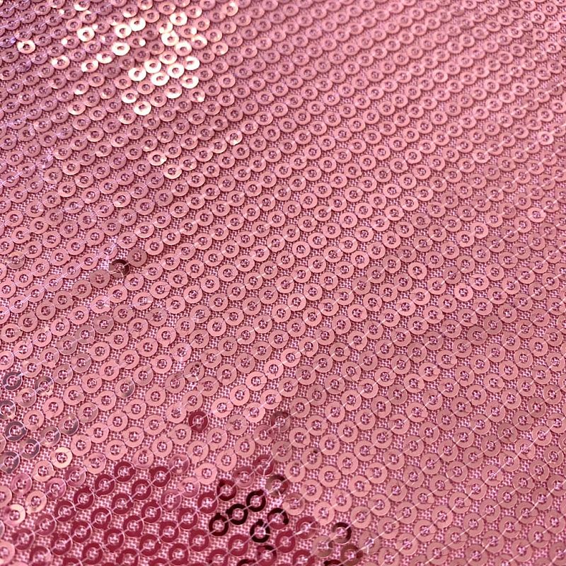 Блестящие пайетки ярко-розового оттенка. Мелкие, размером около 2 мм. Основа - "холодное" тонкое трикотажное полотно, комфортное в носке. Ткань не прозрачная, тянется.  Подойдет для вечернего коктельного платья или юбки, комбинезона, топа, танцевальных и сценических костюмов.