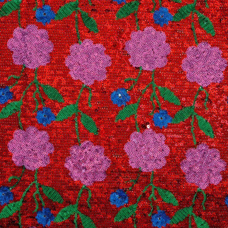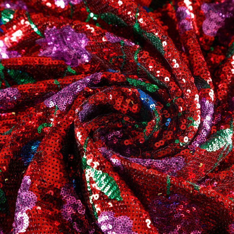 Эластичная сетка черного цвета по всей поверхности усеяна глянцевыми пайетками, который образуют яркий цветочный рисунок на красном фоне. Ткань очень хорошо драпируется, красиво переливается, имеет глянцевый блеск, пластичная и эластичная. Пайетки — идеальный материал для праздников и вечеринок. Из них получится эффектное платье, жакет, боди, туника, юбка или комбинезон.