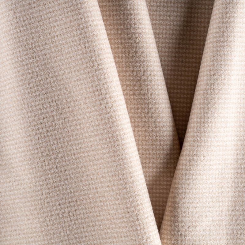 Трикотаж средней толщины, хорошо тянется. Мелкий ненавязчивый узор "гусиная лапка" образуется переплетением молочных и бежевых нитей. Ткань не сухая, мягкая, но плотная, не просвечивает, теплая, хорошо драпируется. Отлично подойдет для пошива легкой верхней одежды, жакетов, костюмов, юбок.