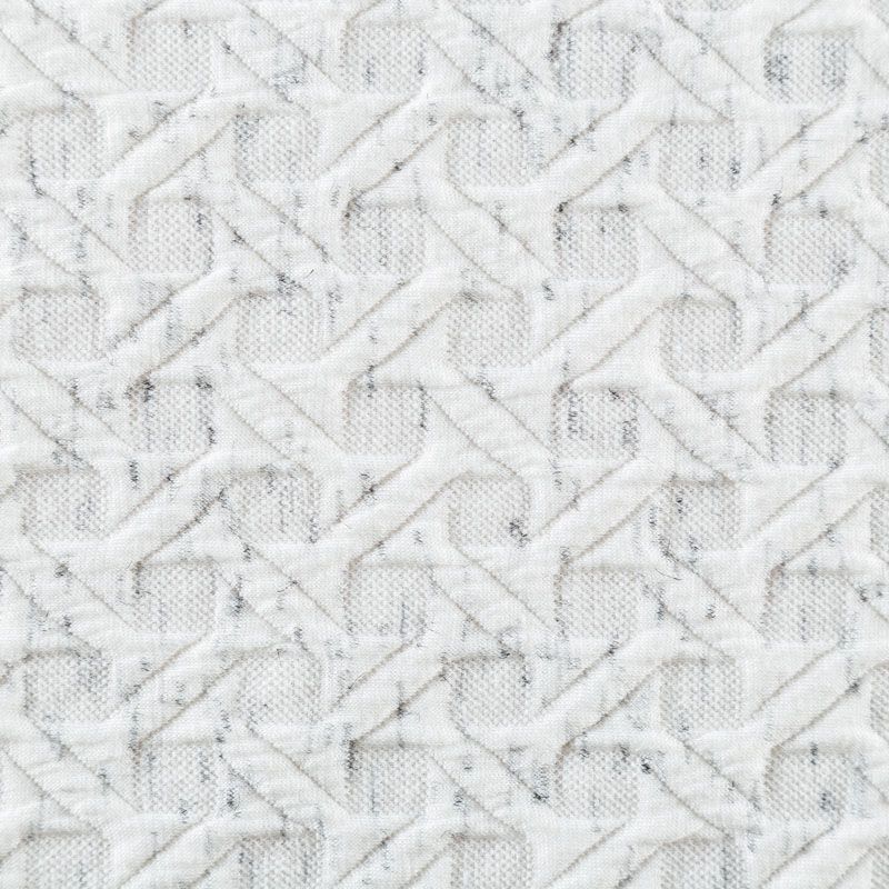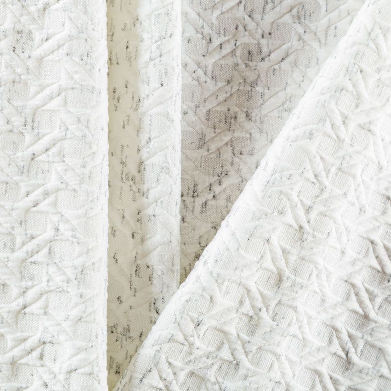 Плотное трикотажное жаккардовое полотно с имитацией стежки. Поверхность ткани объемная, мягкая, приятная на ощупь. Трикотаж не просвечивается, хорошо тянется за счет эластана в составе, держит форму. Прекрасно подойдет для пошива легких пальто, курток, бомберов, кардиганов, платьев, юбок, шорт.