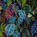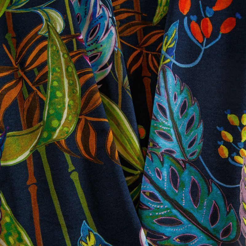 Итальянский мягкий хлопковый трикотаж черного цвета с ярким разноцветным тропическим принтом, гладкий, с красивым лоском. Материал очень приятный на ощупь, достаточно плотный, но при этом тонкий, просвечивает только при растяжении, сминается, но восстанавливется. Отлично тянется за счет плетения и содержания эластана. Отлично подойдет для пошива летних костюмов, топов, майки, футболки, платья, домашней одежды.