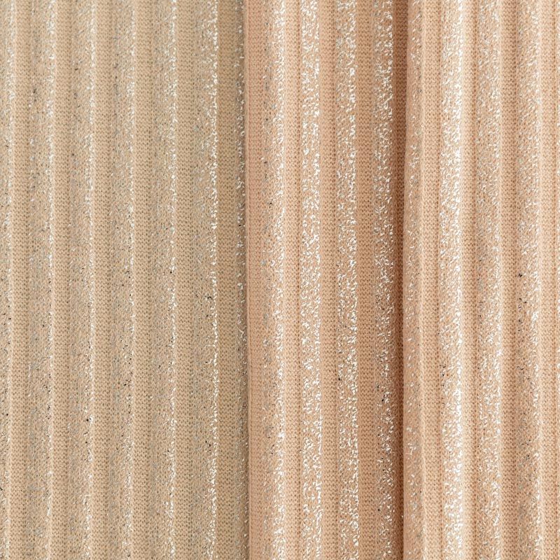 Трикотаж-лапша средней плотности, с высокой степенью эластичности, поверхность рельефная за счет эффекта резинки и мерцающая за счет металлизированного напыления. С изнанки трикотаж гладкий, комфортный, подходит для использования без подклада. Сшить из такого полотна можно водолазки, платья, топы, юбки, комплекты, нарядные изделия. Направление полос - вдоль линии кромки.