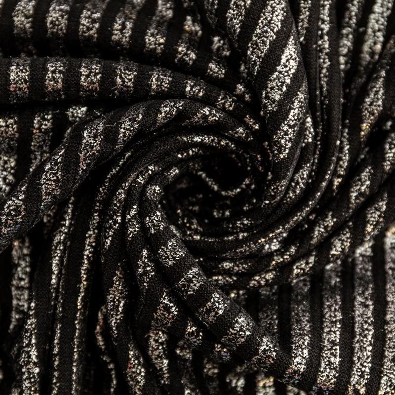 Трикотаж-лапша средней плотности, с высокой степенью эластичности, поверхность рельефная за счет эффекта резинки и мерцающая за счет металлизированного напыления. С изнанки трикотаж гладкий, комфортный, подходит для использования без подклада. Сшить из такого полотна можно водолазки, платья, топы, юбки, комплекты, нарядные изделия. Направление полос - вдоль линии кромки.
