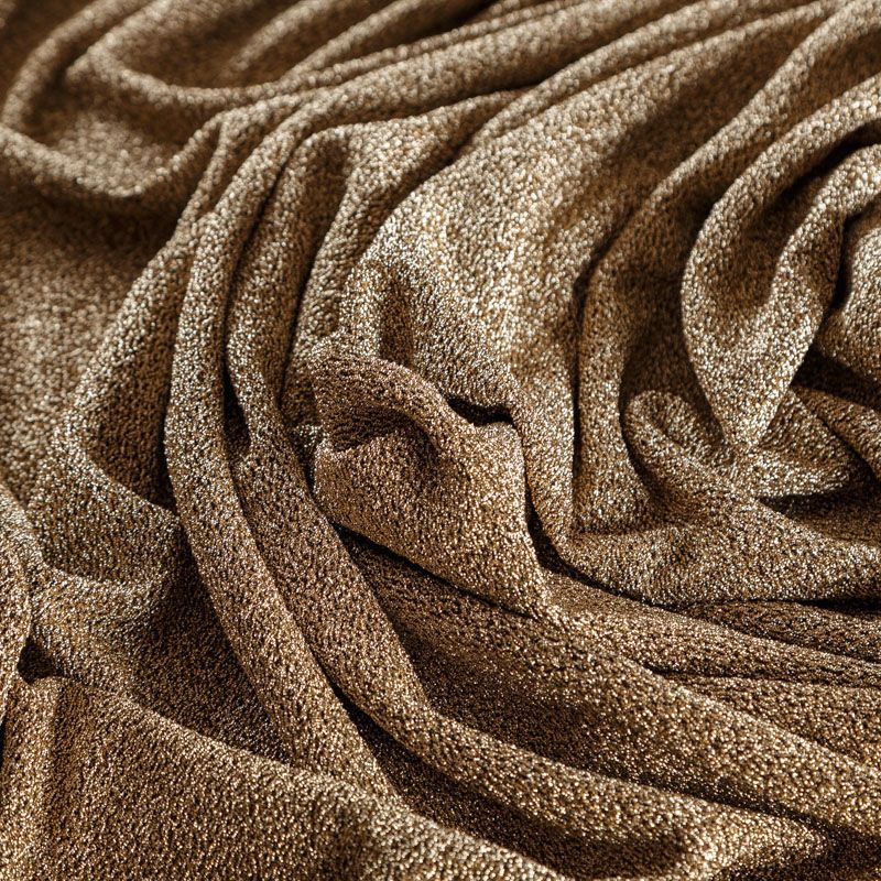 Трикотажное полотно с металлизированным блеском и  мерцанием. Золотистые люрексные нити вплетены в структуру полотна и создают объемный "вспененный" эффект, при этом изнанка гладкая и ровная. Ткань очень приятная к телу, не колется, не просвечивается, очень эластичная, отлично драпируется и ниспадает, красиво ляжет по фигуре. Идеальный вариант для пошива вечерних и нарядных платьев облегающего силуэта, топов, комбинезона, юбки, широких брюк, туник, кардиганов, накидок.