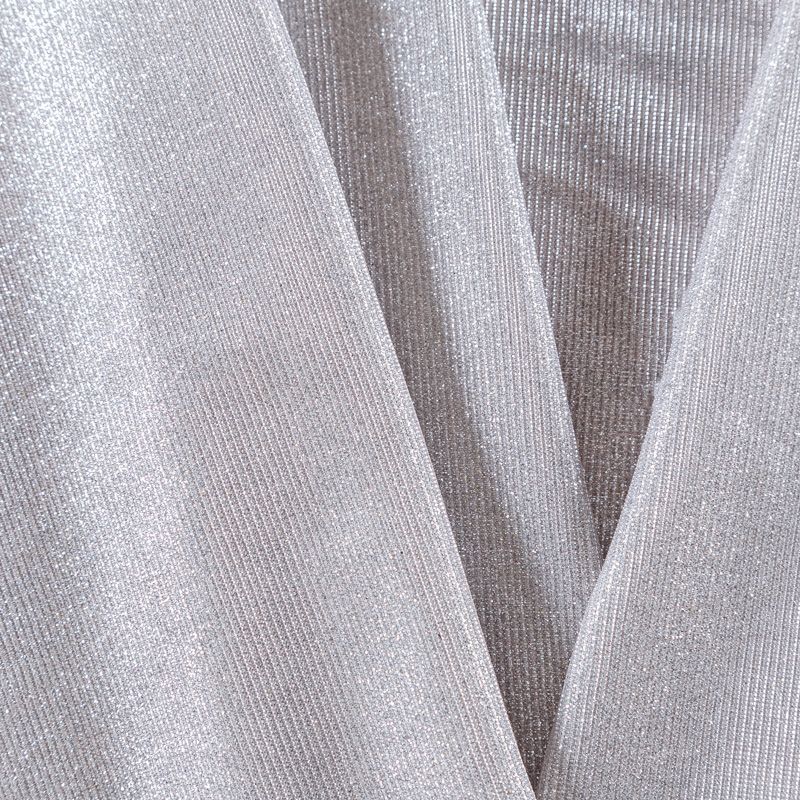 Трикотажное полотно средней плотности с добавлением серебристой люрексной нити. Поверхность шероховатая на ощупь, ткань пластичная, хорошо тянется, не просвечивает. Прекрасно подойдет для пошива лонгслива, гольфа, футболки, кардигана, жакета, платья или юбки в спортивном стиле.