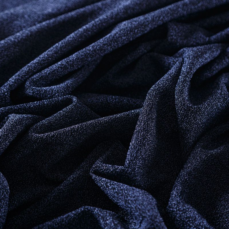 Трикотажное полотно с металлизированным блеском и  мерцанием. Люрексные нити синего оттенка вплетены в структуру полотна и создают объемный "вспененный" эффект, при этом изнанка гладкая и ровная. Ткань очень приятная к телу, не колется, не просвечивается, очень эластичная, отлично драпируется и ниспадает, красиво ляжет по фигуре. Идеальный вариант для пошива вечерних и нарядных платьев облегающего и свободного силуэта, топов, комбинезона, юбки, широких брюк, туник, кардиганов, накидок.