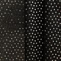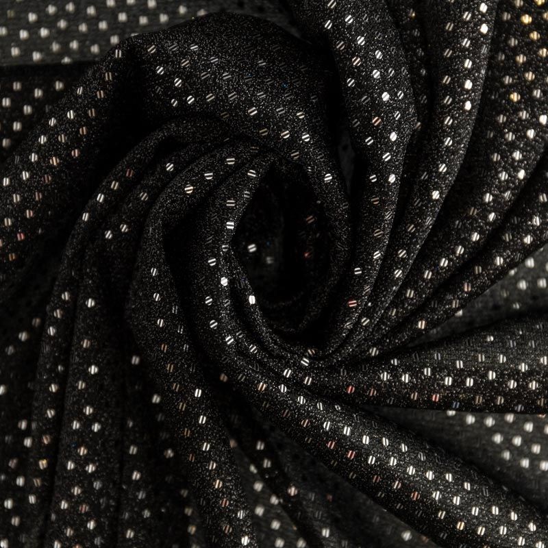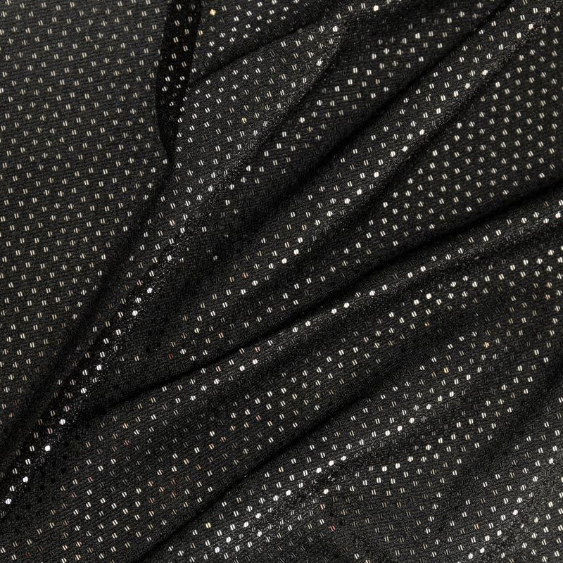 Трикотаж черного цвета с серебристой люрексовой нитью и мелкими пайетками. Мягкая и эластичная ткань, великолепно драпируется и красиво облегает. Тонкий, просвечивает, требуется подклад. Прекрасно подходит для изделий по фигуре, а также нарядов с мягкими складками. Трикотаж можно использовать для вечерних образов — платья, блузки, топы, кофточки и боди и для пошива танцевальных и сценических костюмов.