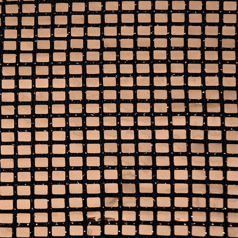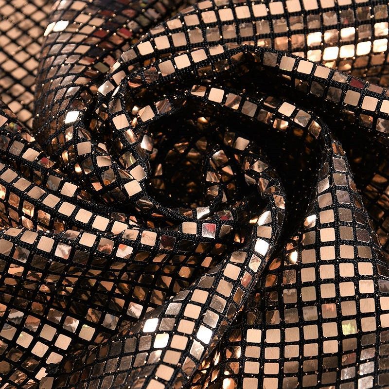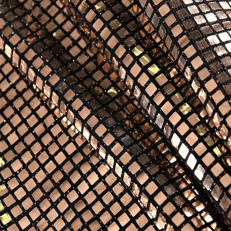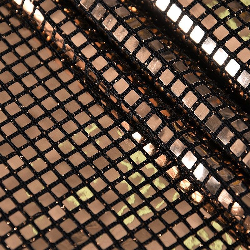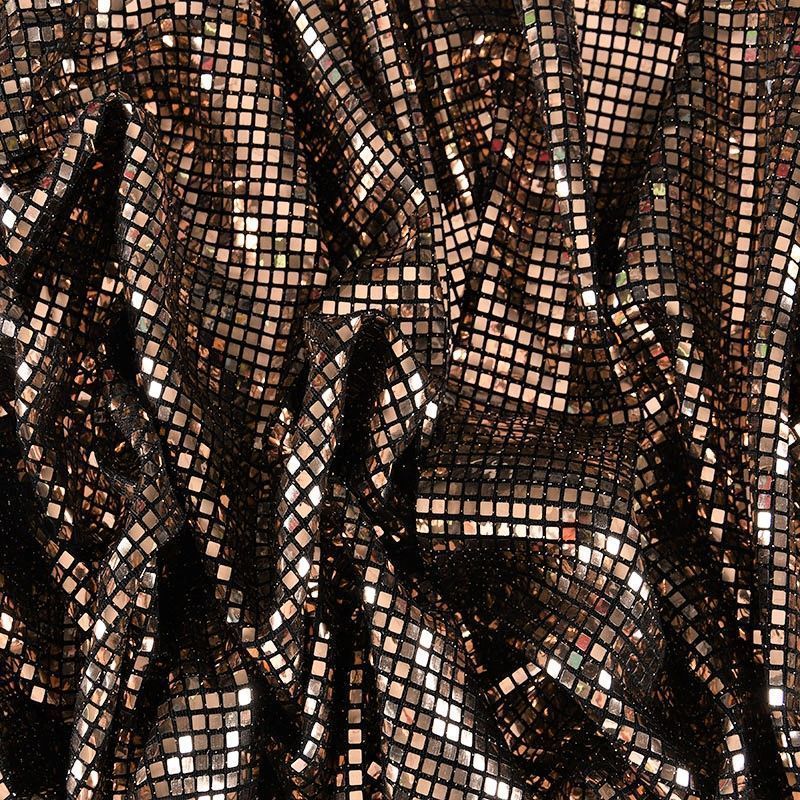 Трикотажное черное полотно с блестящими зеркальными золотистыми квадратными пайетками. Декор накатан на основу, поэтому будет комфортен в носке. Ткань пластичная, прекрасно драпируется и укладывается в складки, легко садится по фигуре за счёт основы с эластаном, не прозрачная, позволит шить изделия без подклада. Идеально подойдет для пошива нарядных вечерних образов: платья, юбки, топа, туники, широких брюк, жакета, кардигана.
