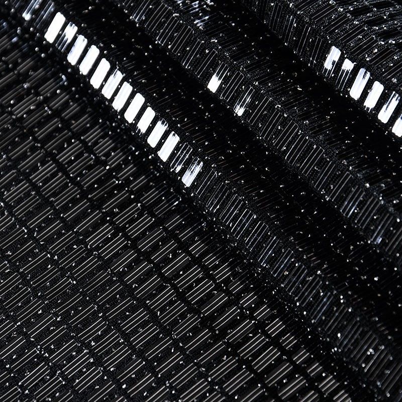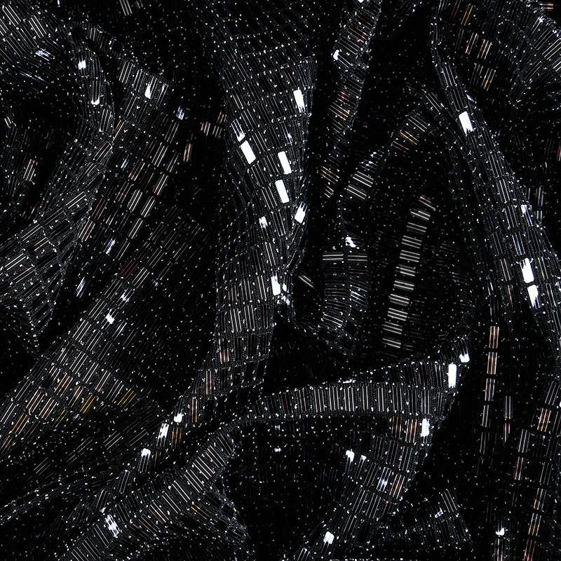 Трикотажное черное полотно с блестящими глянцевыми пайетками и серебристой люрексной нитью. Декор накатан на основу, поэтому будет комфортен в носке. Ткань пластичная, прекрасно драпируется и укладывается в складки, легко садится по фигуре за счёт основы с эластаном, не прозрачная, позволит шить изделия без подклада. Идеально подойдет для пошива нарядных вечерних образов: платья, юбки, топа, туники, широких брюк, жакета, кардигана.